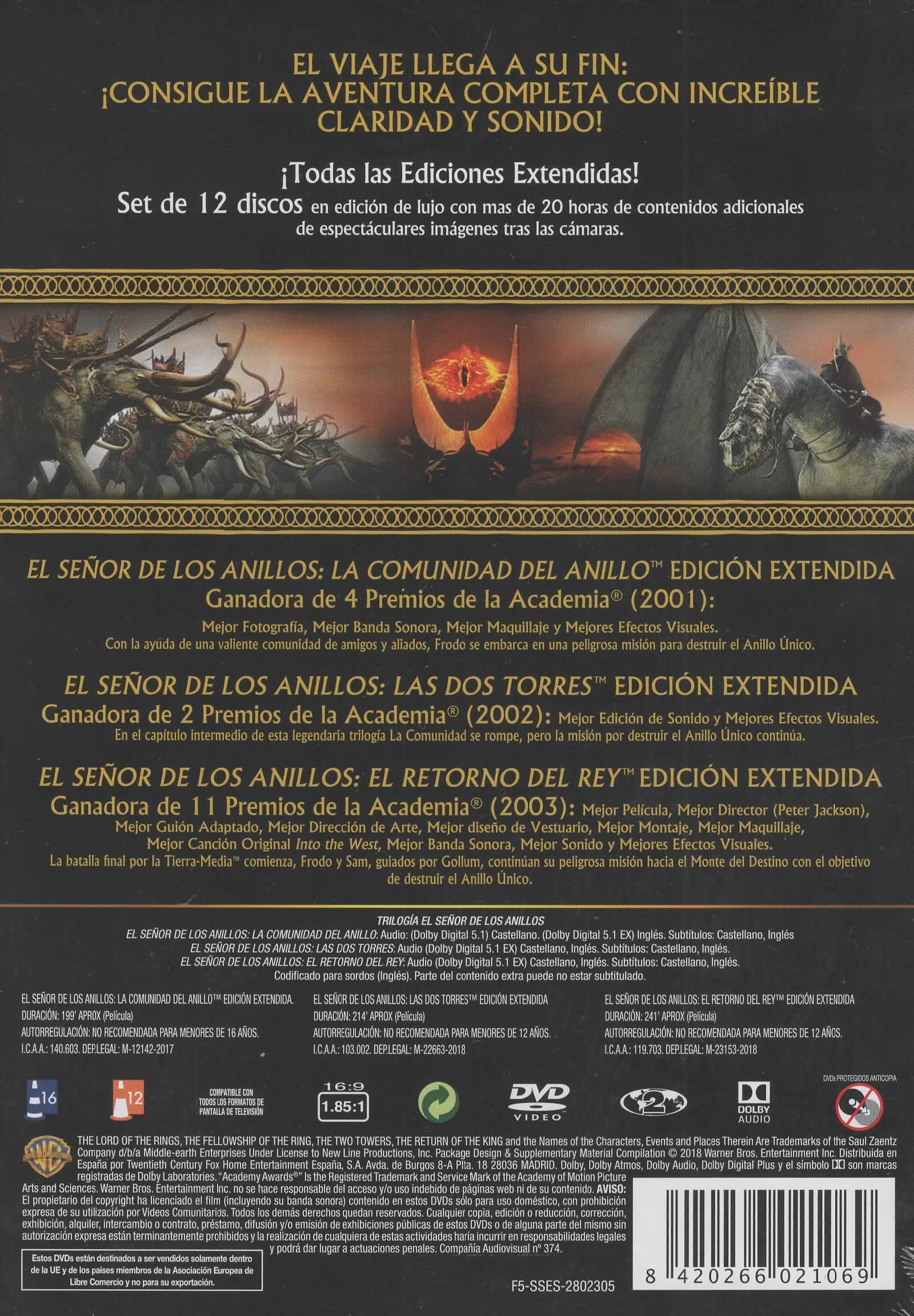 https://back.dvdstorespain.es/en/films/53047-trilogia-el-senor-de-los-anillos-extendida-dvd--8420266021069.html53047Trilogía El Señor De Los Anillos Extendida [DVD]<div id="productDescription" class="a-section a-spacing-small"><br /><p></p><p><span class="a-text-bold">The Lord of the Rings: The Fellowship of the Ring.</span> <span><br />This film tells how the Rings of Power are created. Not to be missed. To understand the plot of the trilogy. There are 3 rings for the Elven Kings, 7 for the Dwarf Lords, 9 for the Mortal Men and 1 for the Dark Lord. All the rings remain under the power of the One Ring, which was responsible for corrupting all the owners who possess it. Bilbo possessed it for many years, almost 60 without knowing its true nature, but it amused him because it made him invisible. Bilbo, convinced by Gandalf, gives the ring to Frodo (undisputed protagonist of the trilogy). Frodo takes care of it to unsuspected limits...Do not resist, immerse yourself in the longest story ever told but in which you go deeper without being able to escape.<br /><br /></span> <span class="a-text-bold">The Lord of the Rings: The Two Towers.</span> <span><br />This second installment of the trilogy begins where we leave Frodo Baggins with Sam Gamyi. This is where the strange creature Gollum appears and tries incessantly to take the ring from them. He gives them his promise to guide them to Mordor. When passing through the Black Gate of Mordor, where they cannot pass due to the protection they have. They are captured by Faramir, son of the senessal of Gondor who discovers that they carry the one ring. Faramir decides to free them so they can complete their mission.<br /><br /></span> <span class="a-text-bold">The Lord of the Rings: The Return of the King.</span> <span><br />It all begins in a kind of dream, where Smeagol appears murdering his great friend Déagol.<br /> Gollum leads Frodo and Sam through the Morgul Mines. From there they see their armies heading towards the fight.<br /> The army achieves victory in The Battle of Helm's Deep, a company of soldiers from Roha, Gandalf, Aragrn, Legolas, Gimlil, Théoden and Éomer head towards Isengard and find it completely in ruins, destroyed by the Ents. Among the ruins Pippin found Saruman's Palantir which Gandalf quickly guarded.<br /> After many adversities Frodo and Sam arrived at Mount Doom. There Gollum reappears wanting to recover the ring. After a fight in which he goes so far as to tear off his finger to get the ring, they fight in front of the abyss where Gollum and the ring fell into the flames and were destroyed.<br /> Frodo is rescued by Gandalf and the hobbits were honored in Gondor where Aragorn was crowned king. They returned to the Shire, where Frodo is writing his memoirs, leaving Sam to finish the book. In the end they embark for the Undying Lands with Gandalf, Elrond, Bilbo, Galadriel and the remaining elves.<br /><br /></span> <span class="a-text-bold">Additional features</span><span><br /><br /></span> <span class="a-text-bold">Disc 1 (Blu-ray)</span> <span><br />- Comments from the Director and the scriptwriters.<br /> - Comments from the production and design team.<br /> - Comments from the cast.<br /><br /></span> <span class="a-text-bold">Disc 2 (Blu-ray)</span> <span><br />- Comments from the Director and the scriptwriters.<br /> - Comments from the production and design team.<br /> - Comments from the cast.<br /><br /></span> <span class="a-text-bold">Disc 3 ( DVD )</span> <span><br />- The appendages. Part 1. From the book to the screen.<br /> - Introduction. Peter Jackson.<br /> - JRR Tolkien: Creator of Middle Earth.<br /> - From book to script.<br /> - Vignettes and preview: Turning words into images.<br /> - Designing Middle Earth.<br /> - Interactive maps: Atlas of Middle Earth.<br /> - New Zealand becomes Middle Earth.<br /> - Galleries with audio comments.<br /> - Storyboards and preview.<br /><br /></span> <span class="a-text-bold">Disc 4 ( DVD )</span> <span><br />- The appendages. Part 2. From screen to reality.<br /> - Introduction. Elijah Wood.<br /> - The cast community.<br /> - A day in the life of a hobbit.<br /> - Chambers in Middle Earth.<br /> - Gigan-tures.<br /> - Scale.<br /> - Weta Digital.<br /> - Assembly: Assembled an epic story.<br /> - Montage: Assembling an epic story.<br /> - Digital graduation.<br /> - The sounds of Middle Earth.<br /> - Music of Middle Earth.<br /> - The road never ends...<br /> - Production galleries.<br /><br /></span> <span class="a-text-bold">Disc 5 ( DVD )</span> <span><br />- Behind the scenes. Documentary created by Costa Botes during the filming of Lords of the Rings: The Fellowship of the Ring.<br /><br /></span> <span class="a-text-bold">Disc 6 (Blu-ray)</span> <span><br />- Comments from the Director and the scriptwriters<br /> - Feedback from the production and design team<br /> - Comments from the cast.<br /><br /></span> <span class="a-text-bold">Disc 7 (Blu-ray)</span> <span><br />- Comments from the Director and the scriptwriters.<br /> - Comments from the production and design team.<br /> - Comments from the cast.<br /><br /></span> <span class="a-text-bold">Disc 8 ( DVD )</span> <span><br />- The appendages. Part 3. The journey continues.<br /> - Adaptation of the book to the script.<br /> - The origins.<br /> - The design of Middle Earth.<br /> - A visit to Weta Workshop .<br /> - A look at the creation process of Gollum.<br /> - Interactive maps: Atlas of Middle Earth.<br /> - New Zealand becomes Middle Earth.<br /> - Galleries with audio comments.<br /><br /></span> <span class="a-text-bold">Disc 9 ( DVD )</span> <span><br />- The appendages. Part 4. The battle for Middle Earth has begun.<br /> - Filming The Two Towers.<br /> - Special effects.<br /> - The montage.<br /> - Music and Sound.<br /> - Risky scenes.<br /> - Fighting practices.<br /> - A visit to Weta Digital.<br /> - Interactive sound demonstration in The Battle of Helm's Deep.<br /> - Gal