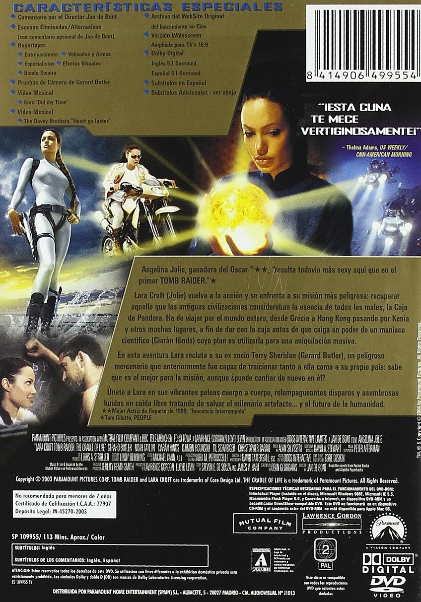 https://back.dvdstorespain.es/en/films/5451-lara-croft-tomb-raider-the-cradle-of-life-dvd--8414906499554.html5451Lara Croft Tomb Raider: The Cradle Of Life [DVD]<div><br /><p><span>Oscar® winner Angelina Jolie "is even sexier here than in the first Tomb Raider."<br /><br /> Lara Croft (Jolie) returns to action and faces her most dangerous mission: recovering what ancient civilizations considered the essence of all evil, Pandora's Box.<br /> He must travel the entire world, from Greece to Hong Kong to Kenya and many other places, in order to find the box before it falls into the hands of a scientific maniac (Ciarán Hinds) whose plan is to use it for mass annihilation. .<br /><br /> In this adventure Lara recruits her former partner Terry Sheridan (Gerard Butler), a dangerous mercenary who was previously capable of betraying both her and his own country: she knows he is the best for the mission, although can she trust him again? he?<br /><br /> Join Lara in her vibrant hand-to-hand fights, lightning-fast gunplay and astonishing free-fall escapes trying to save the ancient artifact... and the future of humanity.<br /><br /><br /> Other features:<br /><br /> Interactive Menus, Direct Access to Scenes, Commentary by Director Jan de Bont, Deleted/Alternative Scenes (with optional commentary by Jan de Bont), Reports:<br /><br /> Training<br /><br /> Vehicles and weapons<br /><br /> Specialists<br /><br /> Visual effects<br /><br /> Soundtrack<br /><br /> Gerard Butler Screen Tests, Kom "Did My Time" Music Video, Davey Brothers "Heart Go Faster" Music Video, Original Website Archive of the theatrical release</span></p></div>https://dvdstorespain.es/244785-home_default/lara-croft-tomb-raider-the-cradle-of-life-dvd-.jpg4.6281instockSony (Paramount)4.62814.6281002015-04-10T21:42:52+0200/Start/Start/DVD/Start/Films/Start/New