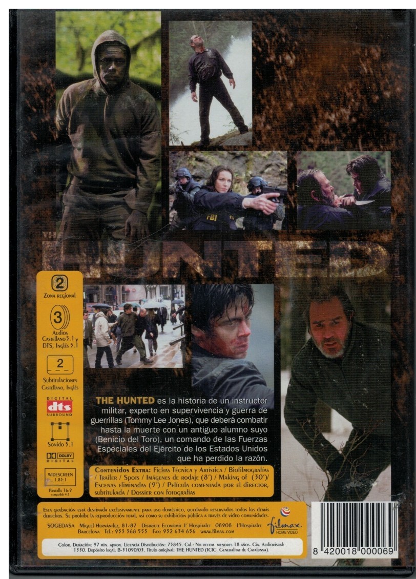 https://back.dvdstorespain.es/en/films/5687-the-hunted-dvd--8420018000069.html5687The Hunted [DVD]<div id="productDescription" class="a-section a-spacing-small"><br /><p><span>The FBI investigates a series of murders of hunters committed in an Oregon forest. An agent specialized in tracking (Jones) captures the murderer (Del Toro), who turns out to be a soldier who had been under his command on dangerous missions, but who, after a traumatic experience in Kosovo, dedicates himself to hunting human beings. When the detainee escapes, a new hunting party begins.</span></p></div>https://dvdstorespain.es/244669-home_default/the-hunted-dvd-.jpg4.876instockParamount4.8764.876002015-04-10T22:46:17+0200/Start/Start/DVD/Start/Films/Start/New