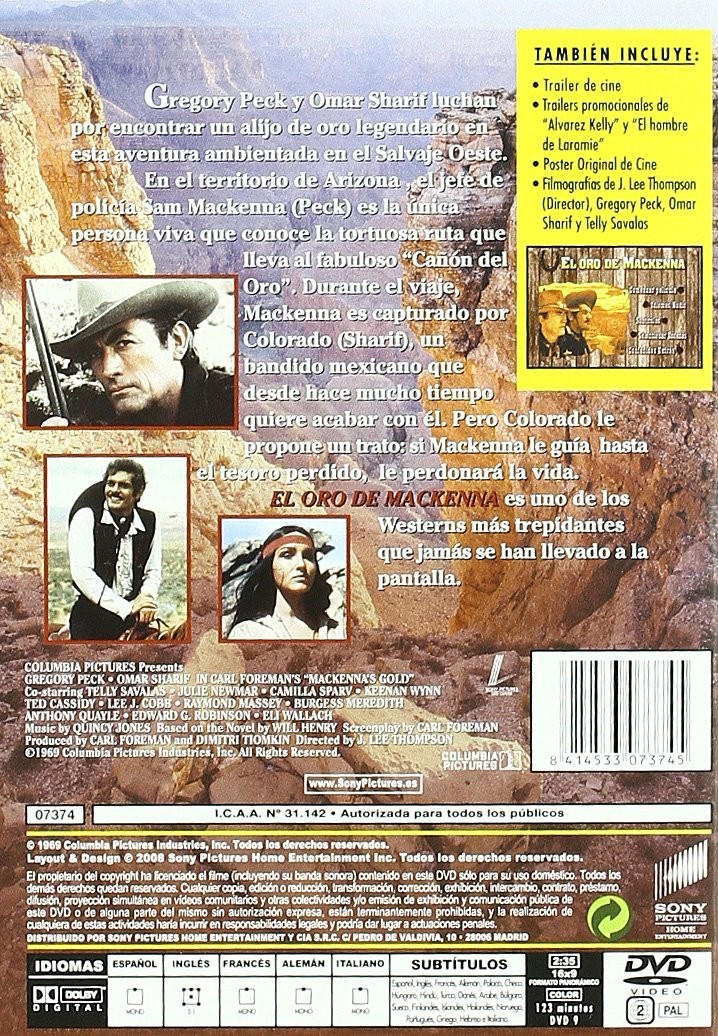 Product Description Seventeen men and four women, including soldiers, deserters, merchants, knights, preachers, gamblers, outlaws and adventurers, search in Indian territory for a legendary vein of gold that, according to tradition, is guarded by the spirit of the Apache tribe. A bandit, named Colorado, forces MacKenna, a sheriff who knows the way, to guide the group to the treasure. The greed and rivalry of the members of the expedition provokes bloody confrontations that result in the death of several men Synopsis Seventeen Men and Four Women, Among Whom Are Soldiers, Deserters, Merchants, Knights, Preachers, Gamblers, Outlaws and Adventurers, They Search In Indian Territory For A Legendary Vein Of Gold Which, According To Tradition, Is Guarded By The Spirits Of The Apache Tribe. A bandit, named Colorado, forces Mackenna, a sheriff who knows the way, to guide the group to the treasure. The Greed and Rivalry of the Members of the Expedition Caused Bloody Clashes That Resulted in the Death of Varios Men.