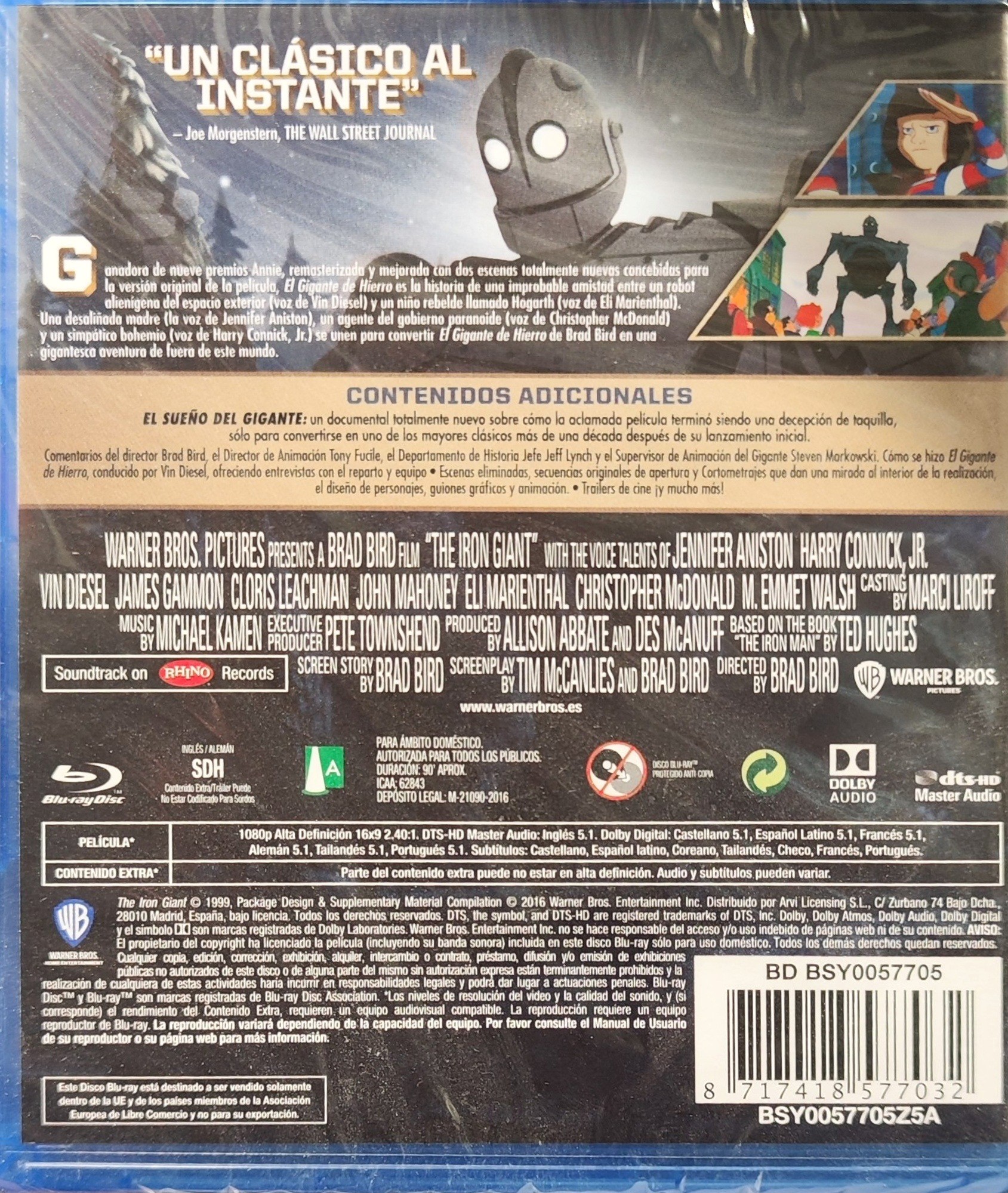 https://back.dvdstorespain.es/en/films/87374-el-gigante-de-hierro-blu-ray--8717418577032.html87374El Gigante de Hierro [Blu-ray] (1999) The Iron GiantEn 1957, en la pequeña localidad de Rockwell, alguien ha visto cómo un enorme hombre metálico caía al mar. Un imaginativo niño descubre que se trata de un robot gigante, cuyo apetito de metal es insaciable. Entre ambos nace una fuerte amistad, pero el gobierno envía a un agente para investigar los hechos. El niño esconde a su nuevo compañero en la chatarrería de un amigo. Pero los habitantes del pueblo comienzan a sentirse aterrados porque creen que es una nueva amenaza en plena Guerra Fría...https://dvdstorespain.es/587684-home_default/el-gigante-de-hierro-blu-ray-.jpg11.4876instockWarner Bros. Entertainment11.487611.4876002020-12-18T00:12:01+0100/Start/Start/Blu-Ray/Start/Films/Start/New