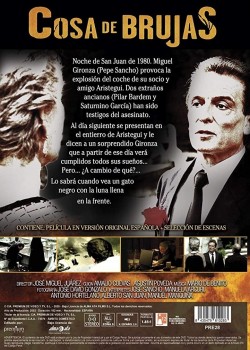 https://back.dvdstorespain.es/en/films/87551-cosa-de-brujas-dvd--8435479610283.html87551Cosa de Brujas [DVD] (2003)Noche de San Juan de 1980: Miguel Gironza (Pepe Sancho) provoca la explosión del coche de su socio y amigo Arístegui. Dos extraños ancianos (Pilar Bardem y Saturnino) han sido testigos del asesinato. Al día siguiente, acompañados de una niña, aparecen en el entierro de Aristegui y le dicen a un sorprendido Gironza que a partir de ese día verá cumplidos todos sus sueños. ¿A cambio de qué? Lo sabrá cuando vea un gato negro con la luna llena en la frente. Veinte años después, la víspera de San Juan, Serafín (Antonio Hortelano), un desdichado mensajero con problemas respiratorios y cardíacos, tiene un accidente con su vespino. En medio del caos, encuentra una cesta en cuyo interior hay un gatito negro con una mancha blanca en la frente. En la cestita viene una dirección, que resulta ser la de la casa de los dos ancianos.https://dvdstorespain.es/433653-home_default/cosa-de-brujas-dvd-.jpg7.9339instockResearch Entertainment7.93397.9339002021-01-27T00:24:04+0100/Start/Start/DVD/Start/Films/Start/New/Start/EVENING SP 70/Start/VELADA DE 80/Start/VELADA FR 80/Start/VELADA IT 80