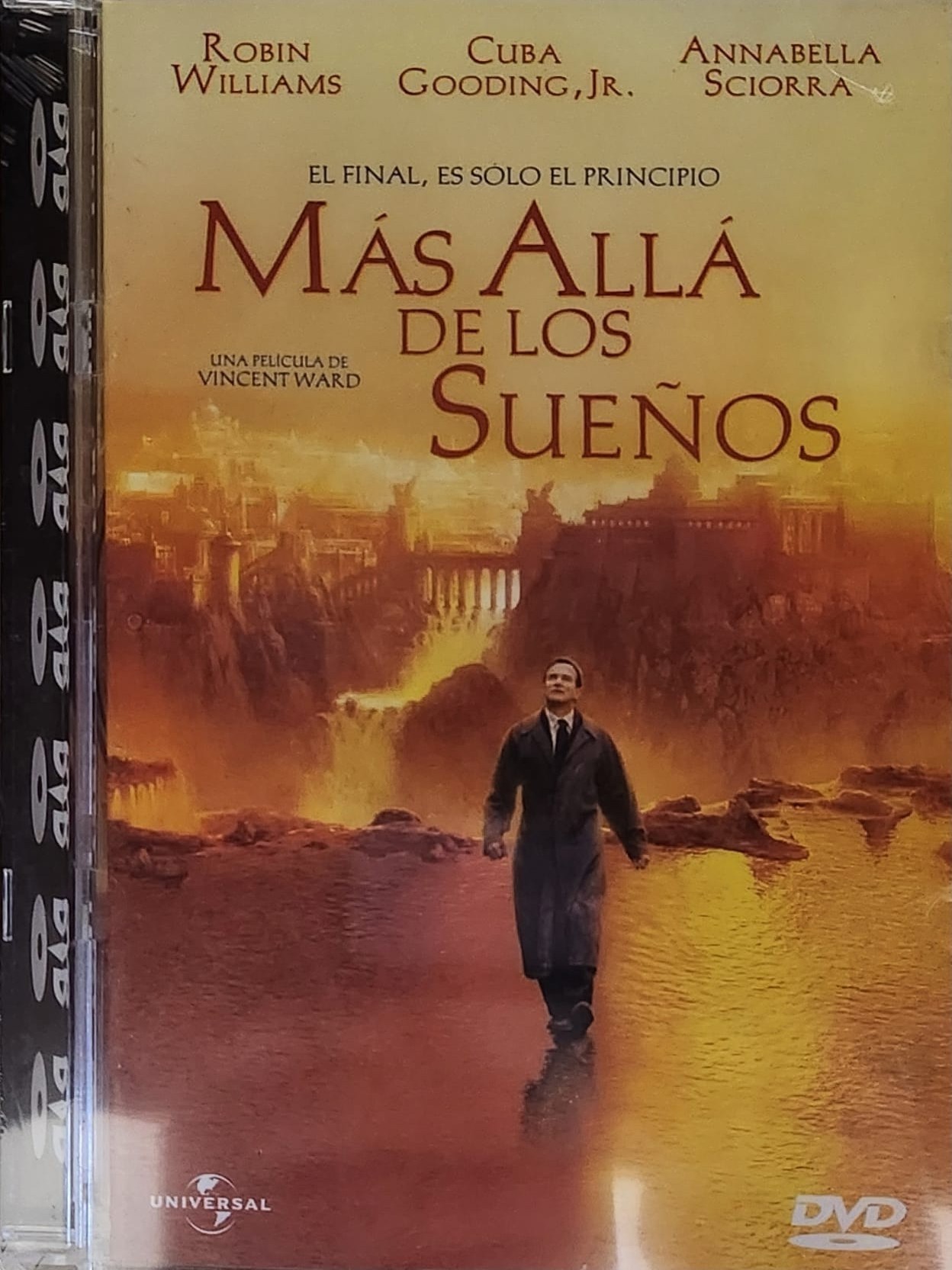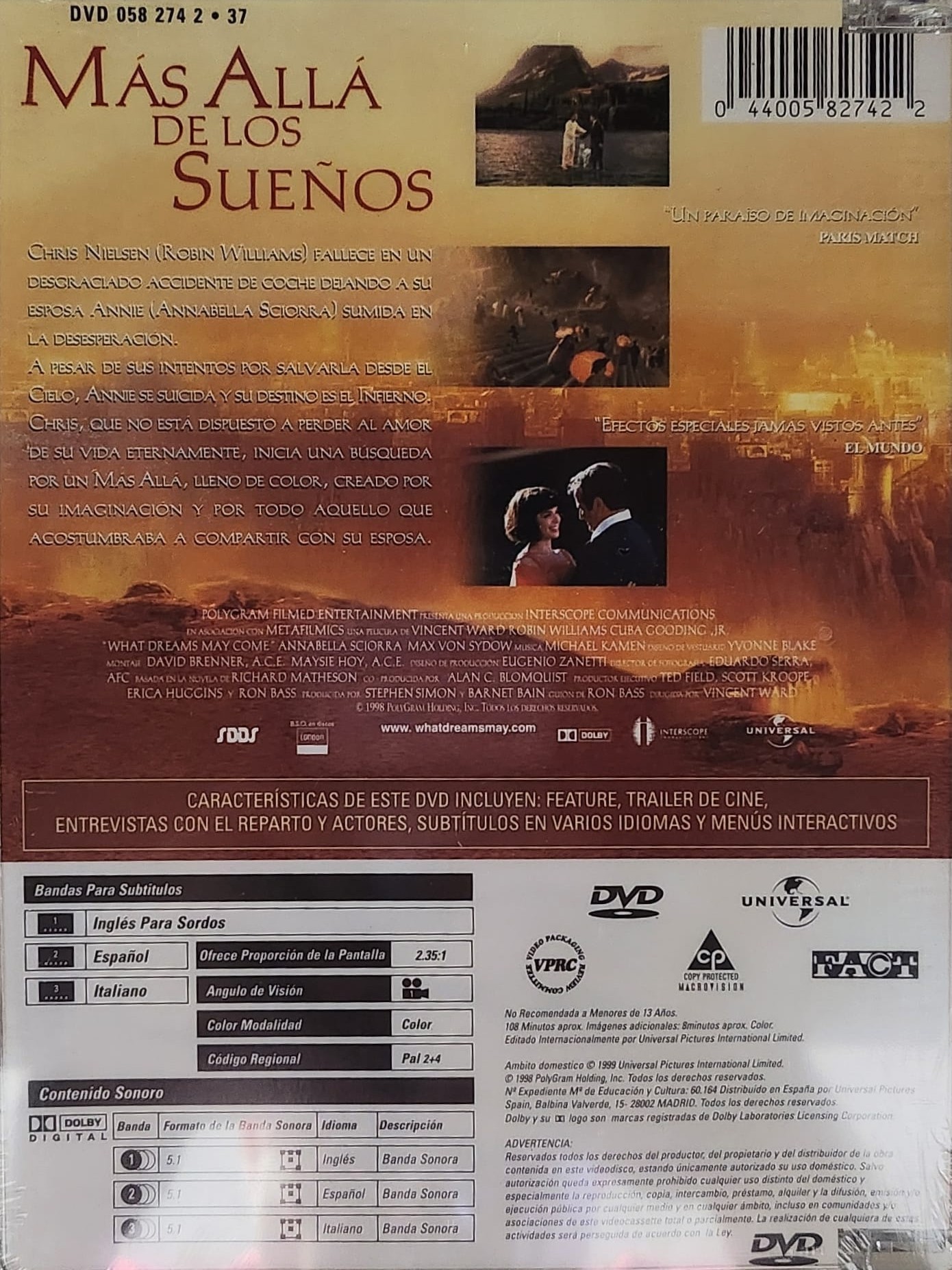 "Chris Nielsen (Robin Williams-La memoria de los muertos) fallece en un desgraciado accidente de coche dejando a su esposa Annie sumida en la desesperación. A pesar de sus intentos de salvarla desde el cielo, Anie se suicida y su destino es el infierno. Chris, que no está dispuesto a perder al amor de su vida eternamente, inicia una búsqueda por un Más Allá, lleno de color, creado por su imaginación y por todo aquello que acostumbraba a compartir con su esposa."