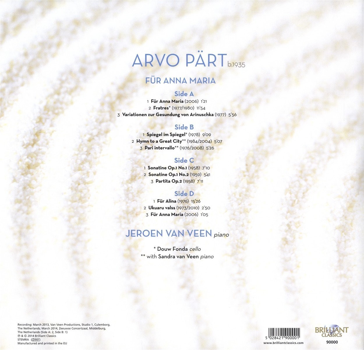 Brilliant Classics publica una serie de aclamadas grabaciones del pianista Jeroen Van Veen, con obras de varios maestros del minimalismo. The Estonian composer Arvo Pärt has never counted himself as among the minimalist number, nor indeed was he schooled in their new traditions, but emerged in the 1960s as an angry and dissonant voice whose musically expressed anger against Communist oppression of his native country could barely be contained within the tumultuous textures of works such as the Third Symphony, but a combination of personal circumstances and aesthetic decisions led him to pare back his style to the world of eerie calm and yet underlying melancholy that has made works such as the Cantus in memoriam Benjamin Britten such an enduring favourite even among audiences who would not otherwise count themselves as aficionados of the European contemporary music scene. But then Pärt has never fitted into any one stylistic box, and alongside the quiet rapture of Für Alina we may find the studentera tinkling of the intriguing early Dance Pieces, as well as arrangements of classics such as Fratres and Spiegel im Spiegel that seem to preserve their special mood no matter what the instrumental forces; a quality they share with works of Pärt's compositional idol, J.S. Bach.