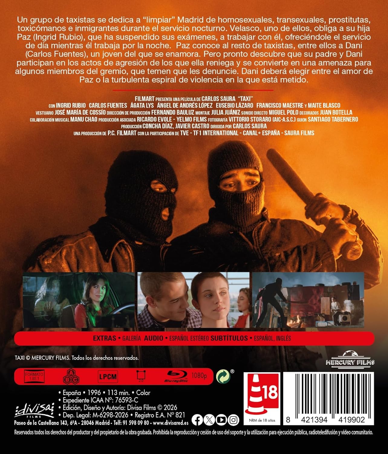 https://back.dvdstorespain.es/en/presale/131593-taxi-1996-carlos-saura-blu-ray-blu-ray-2026--8421394419902.html131593Taxi [Blu-ray] (1996)Por haber suspendido los exámenes, el padre de Paz (Ingrid Rubio), que es taxista, la obliga a aprender la profesión. La chica descubre pronto que su padre es miembro de una banda de taxistas fascistas que, durante el turno de noche, buscan por las calles de Madrid a homosexuales y negros para darles una paliza. Según ellos, lo único que hacen es limpiar la ciudad de indeseables. Lo malo es que Paz se enamora de Dani, un joven atractivo que pertenece al grupo. https://dvdstorespain.es/1166967-home_default/taxi-1996-carlos-saura-blu-ray-blu-ray-2026-.jpg14.4628instock14.462814.4628002026-04-02T03:45:31+0200/Start/Start/Blu-Ray/Start/Films/Start/Presale