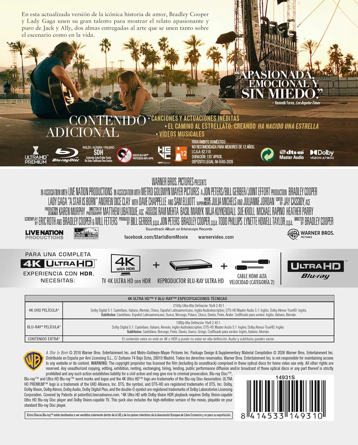 https://back.dvdstorespain.es/en/presale/132143-ha-nacido-una-estrella-4k-uhd-bd-edicion-metalica-blu-ray-2026--8414533149310.html132143Ha Nacido una Estrella (Edición metálica) [4K UHD, Blu-ray] (2018) a Star Is BornJackson Maine (Bradley Cooper) es una estrella consagrada de la música que una noche conoce y se enamora de Ally (Lady Gaga), una joven artista que lucha por salir adelante en el mundo del espectáculo. Justo cuando Ally está a punto de abandonar su sueño de convertirse en cantante, Jack decide ayudarla en su carrera hacia la fama. Pero el camino será más duro de lo que imagina. https://dvdstorespain.es/1177737-home_default/ha-nacido-una-estrella-4k-uhd-bd-edicion-metalica-blu-ray-2026-.jpg23.8843instock23.884323.8843002026-04-23T00:45:02+0200/Start/Start/Films/Start/4K-UHD/Start/Presale