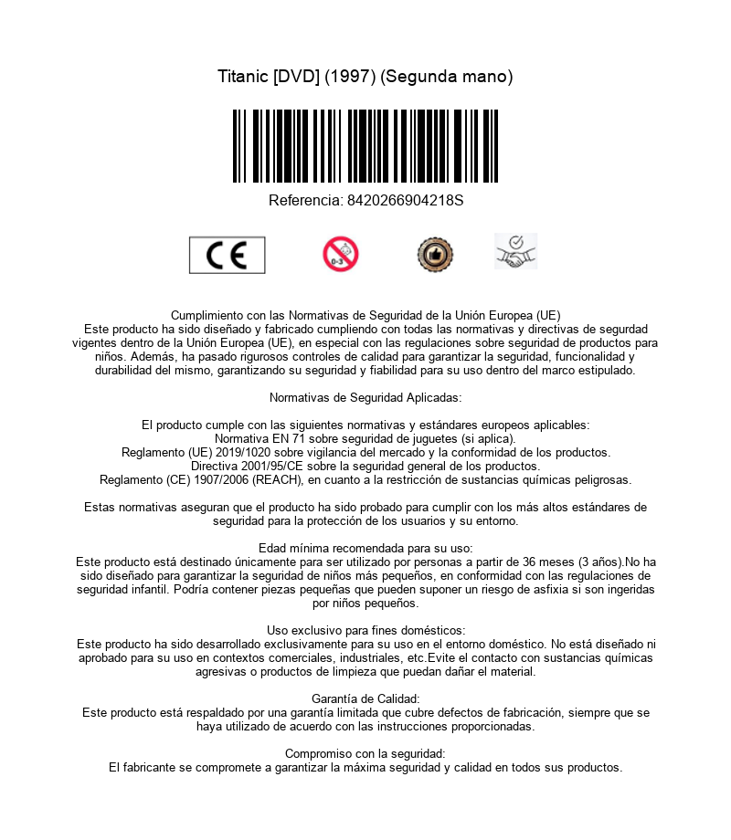 https://back.dvdstorespain.es/en/second-hand/130332-titanic-dvd--8420266904218.html130332Titanic [DVD] (1997) (Segunda mano)Jack (DiCaprio), un joven artista, gana en una partida de cartas un pasaje para viajar a América en el Titanic, el transatlántico más grande y seguro jamás construido. A bordo conoce a Rose (Kate Winslet), una joven de una buena familia venida a menos que va a contraer un matrimonio de conveniencia con Cal (Billy Zane), un millonario engreído a quien sólo interesa el prestigioso apellido de su prometida. Jack y Rose se enamoran, pero el prometido y la madre de ella ponen todo tipo de trabas a su relación. Mientras, el gigantesco y lujoso transatlántico se aproxima hacia un inmenso iceberg.https://dvdstorespain.es/1147775-home_default/titanic-dvd-.jpg4.6281instockFox4.62814.6281002026-03-15T13:29:14+0100/Start/Start/DVD/Start/Films/Start/Second hand