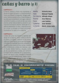 https://back.dvdstorespain.es/en/tv-series/129479-canas-y-barro-dvd-edicion-slim-disco-3-capitulos-5-y-6-dvd-2024--605848048841.html129479Cañas y Barrominiserie (Capítulos 5 y 6, edición slim) [DVD] (1978) Cañas y barroMiniserie de TV (6 episodios) que adapta la novela homónima de Blasco Ibáñez. La acción se desarrolla entre finales del siglo XIX y principios del XX en un pueblo de la albufera valenciana, en un ambiente de pescadores y arroceros. Los protagonistas principales son 'Los paloma': el abuelo, el mejor pescador del lago; el hijo, que ha consagrado su vida a ganar terreno al agua, acarreando tierra en su barca para conseguir, palmo a palmo, un terreno que cultivar, y Tonet, el nieto, la oveja negra de la familia, cuya conducta causa la deshonra de todos.https://dvdstorespain.es/1133508-home_default/canas-y-barro-dvd-edicion-slim-disco-3-capitulos-5-y-6-dvd-2024-.jpg6.6116instock6.61166.6116002026-02-24T02:47:10+0100/Start/Start/DVD/Start/TV series/Start/New