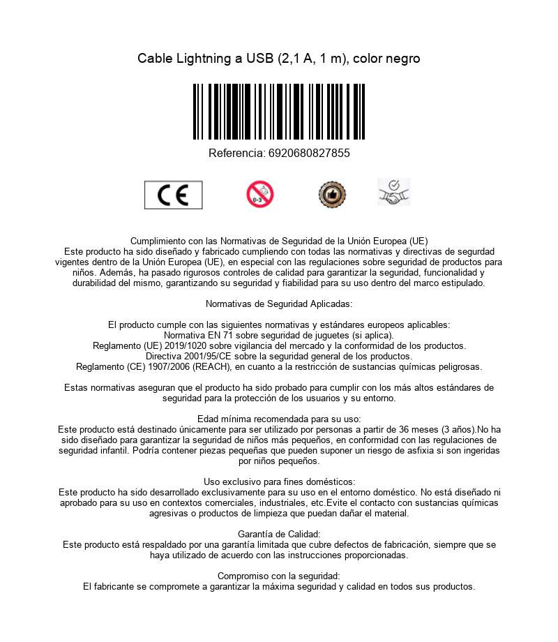 Cable Lightning a USB (2,1 A, 1 m), color negro