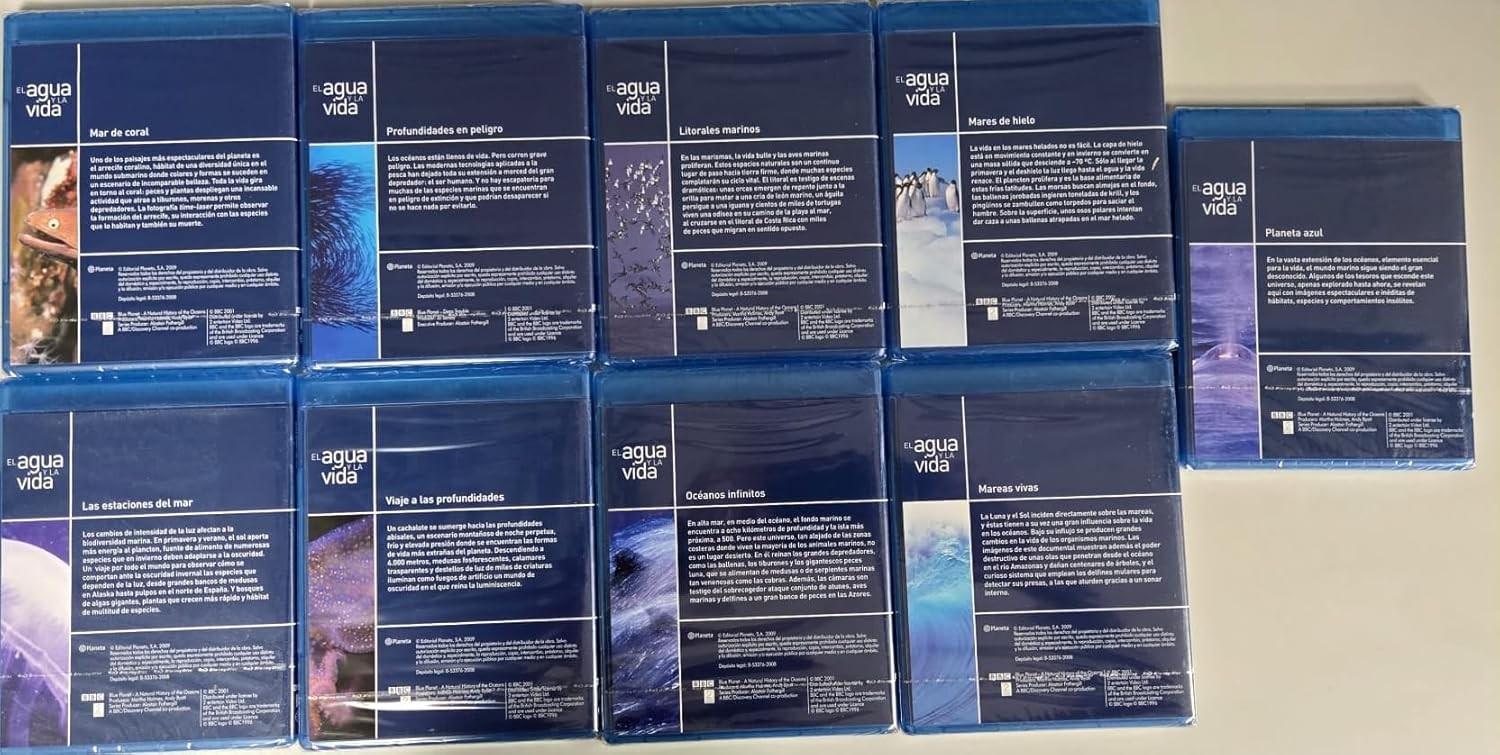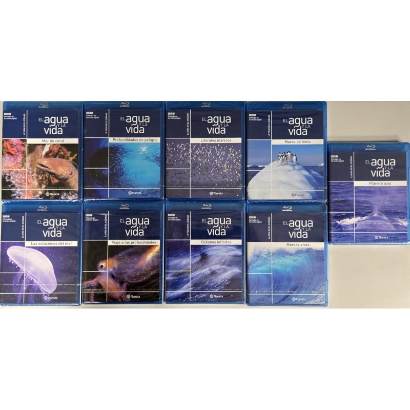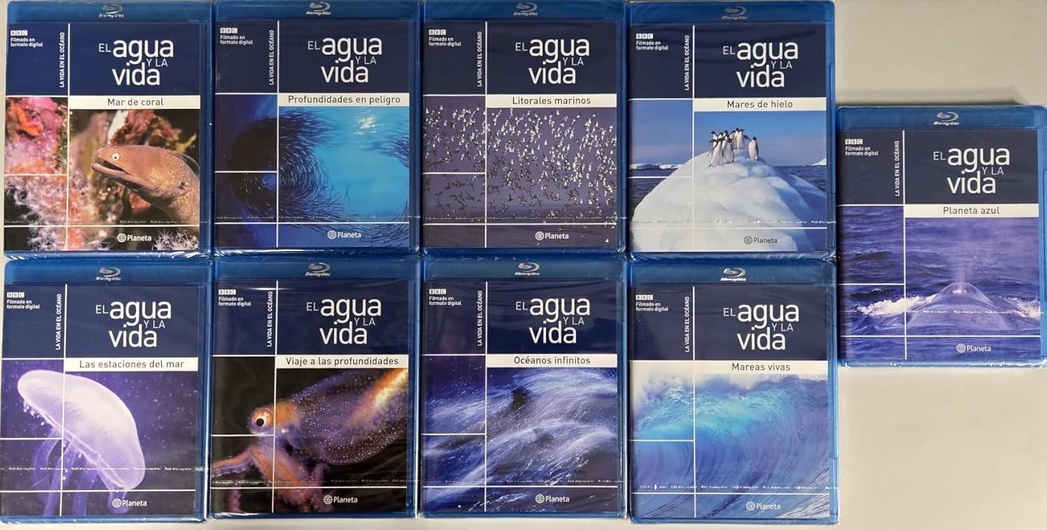 Sumérgete en las maravillas del mundo marino con esta extraordinaria colección de documentales 'El Agua y la Vida', una colaboración entre Planeta y BBC. Esta serie completa de 9 Blu-rays te lleva a un viaje fascinante por los océanos del mundo, revelando la asombrosa diversidad de vida marina y los secretos de nuestros mares. Cada disco está masterizado en alta definición, ofreciendo imágenes espectaculares que capturan la belleza y el misterio de las profundidades oceánicas. Desde las criaturas luminiscentes de las profundidades abisales hasta los majestuosos habitantes de los arrecifes de coral, esta colección documenta la increíble variedad de ecosistemas marinos y sus habitantes. Los documentales combinan cinematografía impresionante con narrativa cautivadora, creando una experiencia educativa y visualmente deslumbrante para toda la familia. Una obra esencial para los amantes de la naturaleza y perfecta para bibliotecas educativas.