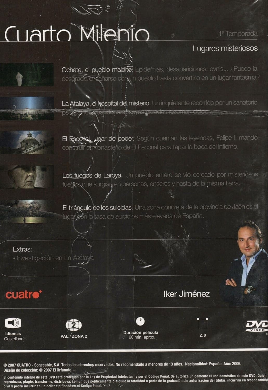 Sumérgete en los misterios más inquietantes de España con esta fascinante edición de Cuarto Milenio: Lugares Misteriosos. Este DVD, con una duración aproximada de 60 minutos, explora cinco ubicaciones enigmáticas que han desconcertado a investigadores durante años. Desde Ochate, el pueblo maldito azotado por epidemias y desapariciones, hasta La Atalaya, un perturbador hospital psiquiátrico abandonado. Descubre los secretos del Escorial, las inexplicables manifestaciones ígneas de Laroya, y el misterioso triángulo de los suicidas en Jaén. El programa, producido por Cuatro, incluye material extra con una investigación especial en La Atalaya. Compatible con sistema PAL (Zona 2) y audio en castellano. No recomendado para menores de 13 años. Una producción española del 2006 que combina investigación rigurosa con la atmósfera misteriosa característica de la serie.