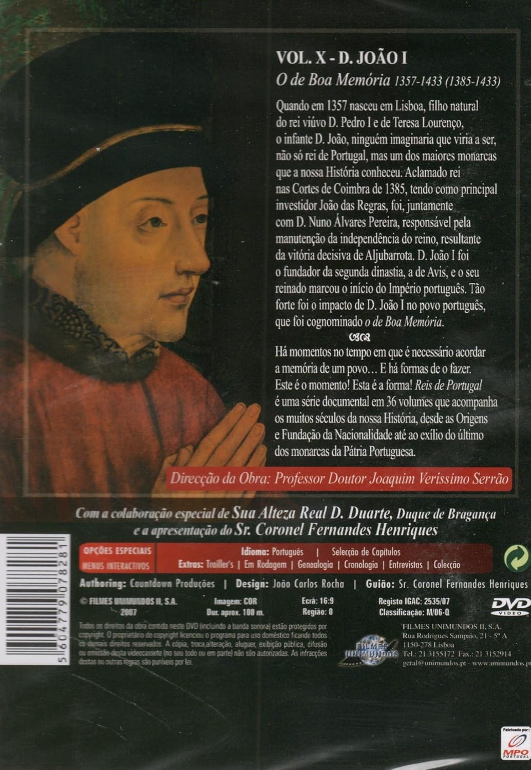 Descubre la fascinante historia de Portugal con este documental sobre D. João I, 'O de Boa Memória' (1357-1433). Este DVD, producido por Filmes Unimundos, forma parte de la prestigiosa serie documental 'Reis de Portugal', que explora los siglos de historia portuguesa desde sus orígenes hasta el fin de la monarquía. El volumen X se centra en uno de los monarcas más influyentes de Portugal, fundador de la dinastía de Avis y arquitecto del imperio portugués. Dirigido por el Professor Doutor Joaquim Veríssimo Serrão, este documental cuenta con la colaboración especial del Duque de Bragança y ofrece una perspectiva profunda sobre el reinado que marcó el inicio de la era dorada portuguesa. El DVD incluye selección de capítulos, entrevistas y material complementario, todo en idioma portugués. Una pieza esencial para estudiantes, historiadores y entusiastas de la historia portuguesa.