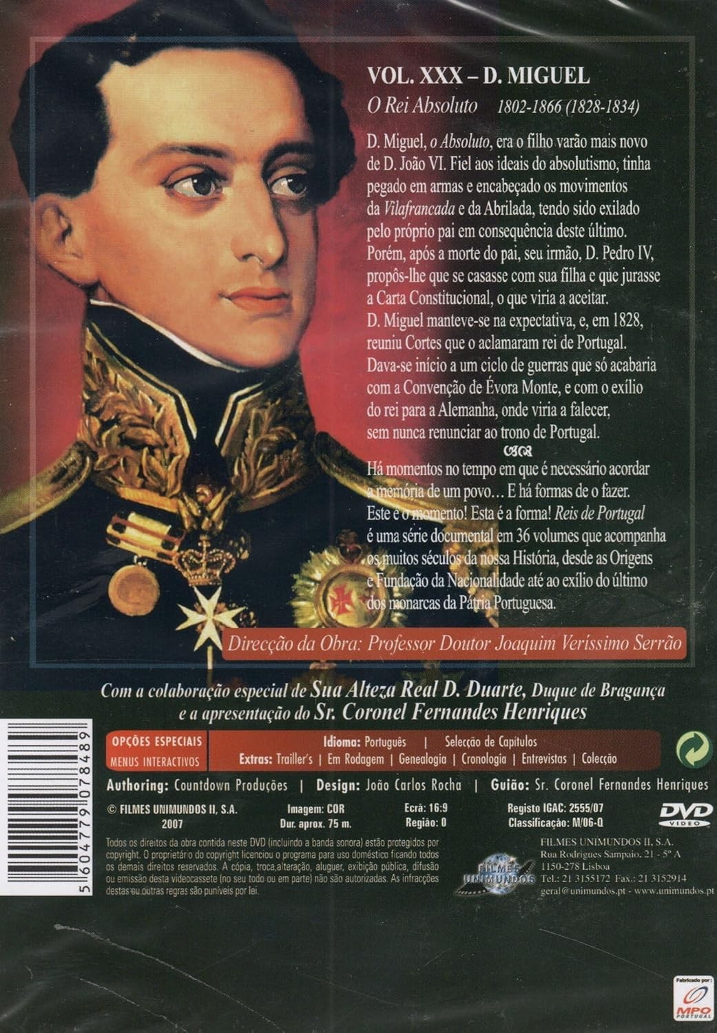 Descubre la fascinante historia de Portugal con este DVD documental sobre D. Miguel, el Rey Absoluto (1802-1866). Este volumen, parte de la prestigiosa serie 'Reis de Portugal', examina detalladamente el reinado y la vida del último monarca absolutista portugués. Con una duración de 75 minutos, el documental ofrece una narrativa cautivadora sobre los acontecimientos históricos que marcaron este período turbulento, incluyendo las guerras civiles y el eventual exilio del monarca. Producido por Filmes Unimundos, este DVD incluye contenido extra como entrevistas, cronología histórica y una colección especial de material de archivo. El documental cuenta con la dirección del Profesor Doctor Joaquim Veríssimo Serrão y la colaboración especial de Su Alteza Real D. Duarte, Duque de Bragança. Disponible en portugués con selección de capítulos para una experiencia de visualización óptima. Una pieza esencial para los entusiastas de la historia portuguesa y coleccionistas de documentales históricos.