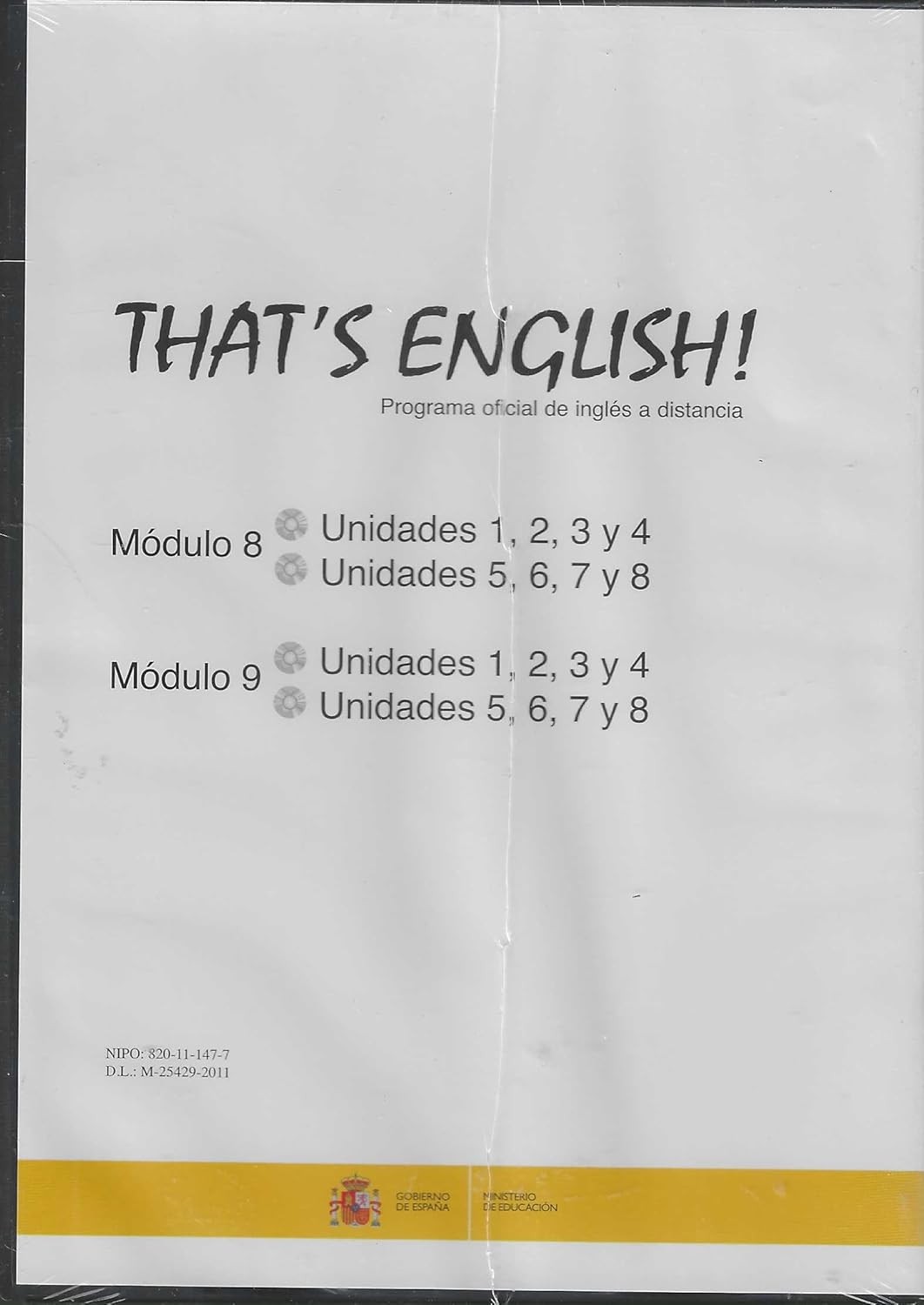 That's English! Módulos 8 y 9 es un programa oficial de inglés a distancia en formato DVD que ofrece un método completo y estructurado para el aprendizaje del idioma inglés. Este conjunto incluye contenido educativo dividido en dos módulos principales, cada uno compuesto por 8 unidades temáticas cuidadosamente organizadas. El Módulo 8 abarca las Unidades 1, 2, 3 y 4, así como las Unidades 5, 6, 7 y 8, mientras que el Módulo 9 presenta la misma estructura con sus respectivas unidades. Desarrollado por el Ministerio de Educación del Gobierno de España, este material audiovisual está diseñado para estudiantes que buscan mejorar sus habilidades en inglés de manera autodidacta. El formato DVD permite un acceso conveniente al contenido desde casa, facilitando el aprendizaje flexible y personalizado. Ideal para estudiantes de nivel intermedio que desean consolidar y expandir sus conocimientos del idioma inglés a través de lecciones estructuradas y progresivas.