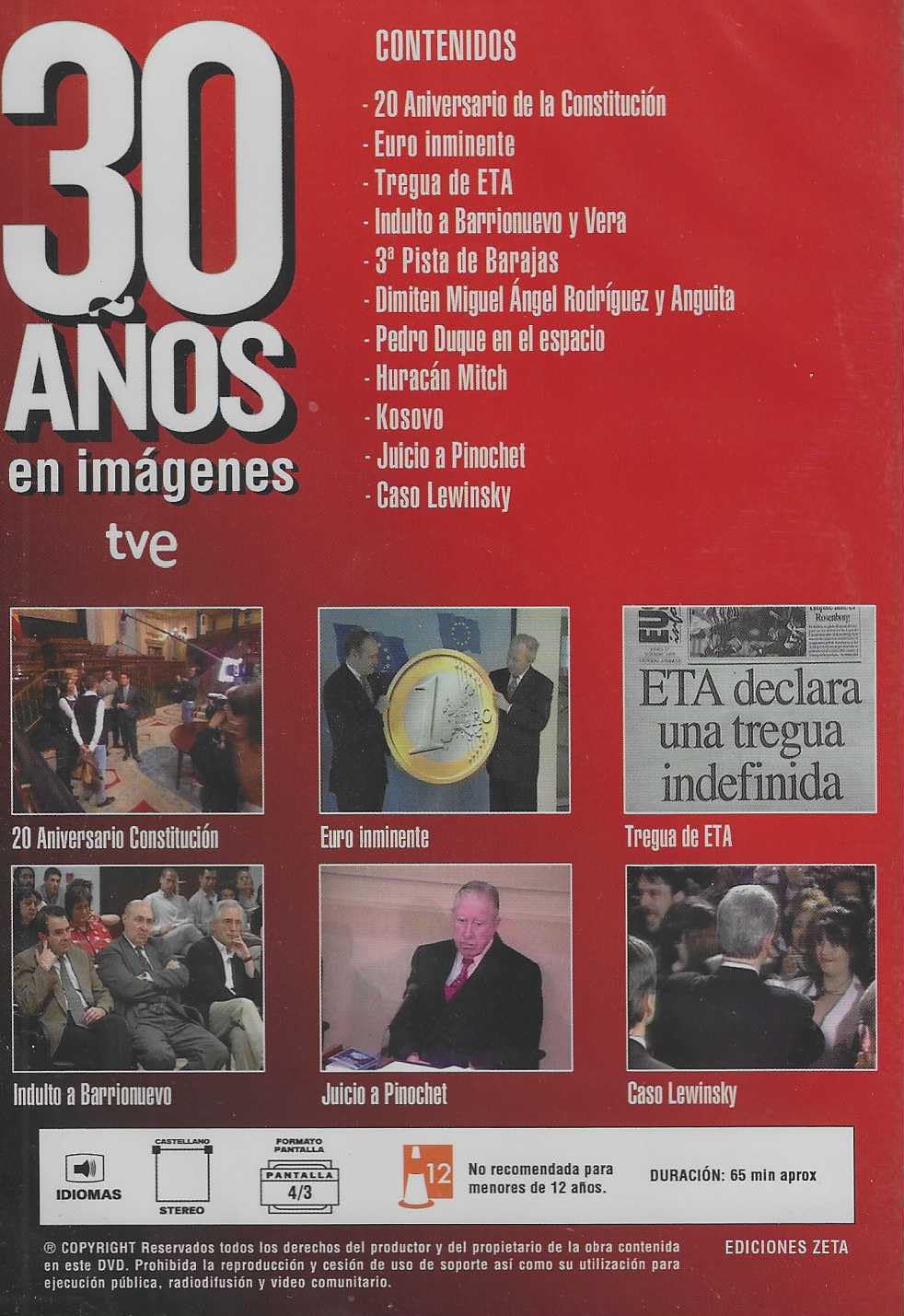 Este DVD de 30 Años en Imágenes recorre los acontecimientos más destacados del año 1998 a través de imágenes de archivo de TVE. Con una duración aproximada de 65 minutos, este documental visual captura momentos históricos que marcaron ese año, incluyendo el 20 aniversario de la Constitución española, la inminente llegada del euro, la tregua declarada por ETA, el indulto a Barrionuevo y Vera, el juicio a Pinochet, el caso Lewinsky, el huracán Mitch, la guerra de Kosovo, y la dimisión de Miguel Ángel Rodríguez y Anguita. También incluye eventos culturales como la tercera edición de la Pista de Barajas y la misión espacial de Pedro Duque. Presentado en formato 4:3 con audio estéreo en castellano, este material audiovisual ofrece una ventana única a los sucesos políticos, sociales y culturales que definieron 1998. No recomendado para menores de 12 años. Una pieza imprescindible para quienes deseen revivir o conocer los momentos clave de la historia reciente española.
