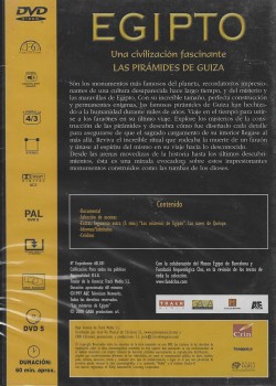 Este fascinante DVD documental te transporta a uno de los lugares más emblemáticos del mundo antiguo: las Pirámides de Guiza. Estos monumentos colosales son recordatorios impresionantes de una civilización desaparecida hace milenios, llenos de misterio y maravillas arquitectónicas. Con su increíble tamaño, perfecta construcción y permanentes enigmas, las pirámides de Guiza han cautivado a la humanidad durante miles de años. Este documental te invita a viajar en el tiempo para unirte a los faraones en su último viaje, explorando los misterios de la construcción de las pirámides y descubriendo cómo fue diseñado cada detalle para asegurar que el sagrado cargamento de su interior llegase al más allá. Revive el increíble ritual que rodeaba la muerte de un faraón y únete al espíritu del mismo en su viaje hacia lo desconocido. Desde las arenas movedizas de la historia hasta los últimos descubrimientos, esta es una mirada evocadora sobre estos impresionantes monumentos construidos como las tumbas de los dioses. Duración aproximada de 60 minutos. Incluye documental, selección de escenas, extras y subtítulos en castellano e inglés.