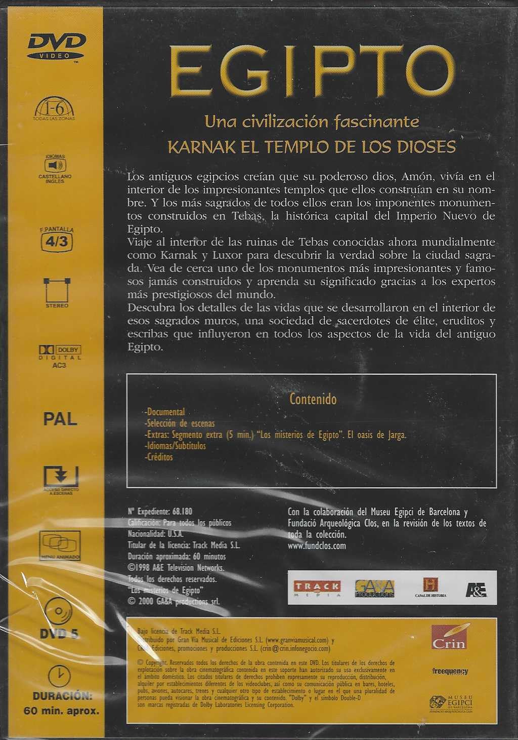 Este fascinante DVD documental te transporta al corazón de una de las civilizaciones más extraordinarias de la historia: el Antiguo Egipto. Explora Karnak, el templo de los dioses, uno de los complejos religiosos más impresionantes jamás construidos en Tebas, la histórica capital del Imperio Nuevo de Egipto. Los antiguos egipcios creían que su poderoso dios Amón residía en el interior de estos monumentales templos, y los construyeron como tributo a su grandeza. A través de este documental de aproximadamente 60 minutos, descubrirás la verdad sobre esta ciudad sagrada y conocerás de cerca los monumentos más famosos del mundo antiguo. Expertos prestigiosos te guiarán para comprender el significado de estas construcciones sagradas, revelando los detalles de las vidas que se desarrollaron entre estos muros: una sociedad de sacerdotes de élite, eruditos y escribas que influyeron en todos los aspectos de la vida del antiguo Egipto. El DVD incluye contenido adicional como selección de escenas, un segmento extra sobre los misterios de Egipto y el oasis de Jarga, galerías fotográficas y créditos. Una experiencia educativa imprescindible para los amantes de la historia y la arqueología.