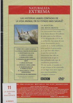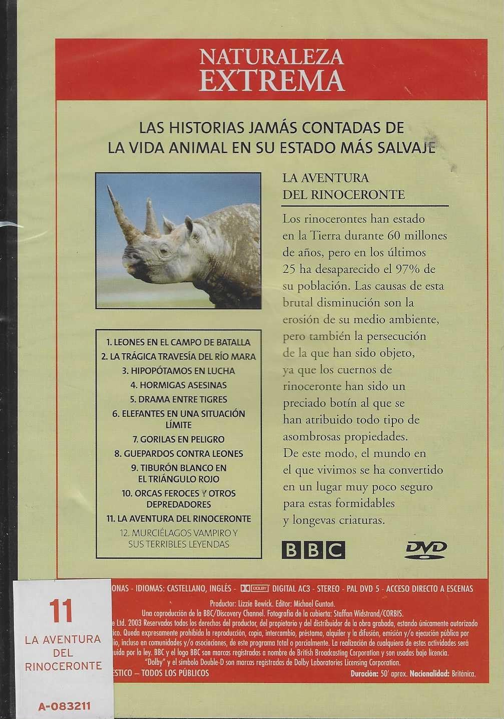 BBC Naturaleza Extrema: La Aventura del Rinoceronte es un fascinante documental en DVD que nos sumerge en el mundo de uno de los animales más antiguos y amenazados del planeta. Los rinocerontes han habitado la Tierra durante 60 millones de años, pero en los últimos 25 años han perdido el 97% de su población debido a la destrucción de su hábitat y la caza furtiva, impulsada por el alto valor atribuido a sus cuernos. Este DVD forma parte de la colección Naturaleza Extrema de BBC, que presenta las historias jamás contadas de la vida animal en su estado más salvaje. El disco incluye además otros episodios como Leones en el Campo de Batalla, Hipopótamos en Lucha, Drama entre Tigres, Gorilas en Peligro y muchos más. Disponible en idiomas castellano e inglés, con audio Dolby Digital AC3 Stereo y formato PAL DVD 5. Con una duración aproximada de 50 minutos, este documental de producción británica es una obra imprescindible para los amantes de la naturaleza y la vida salvaje.