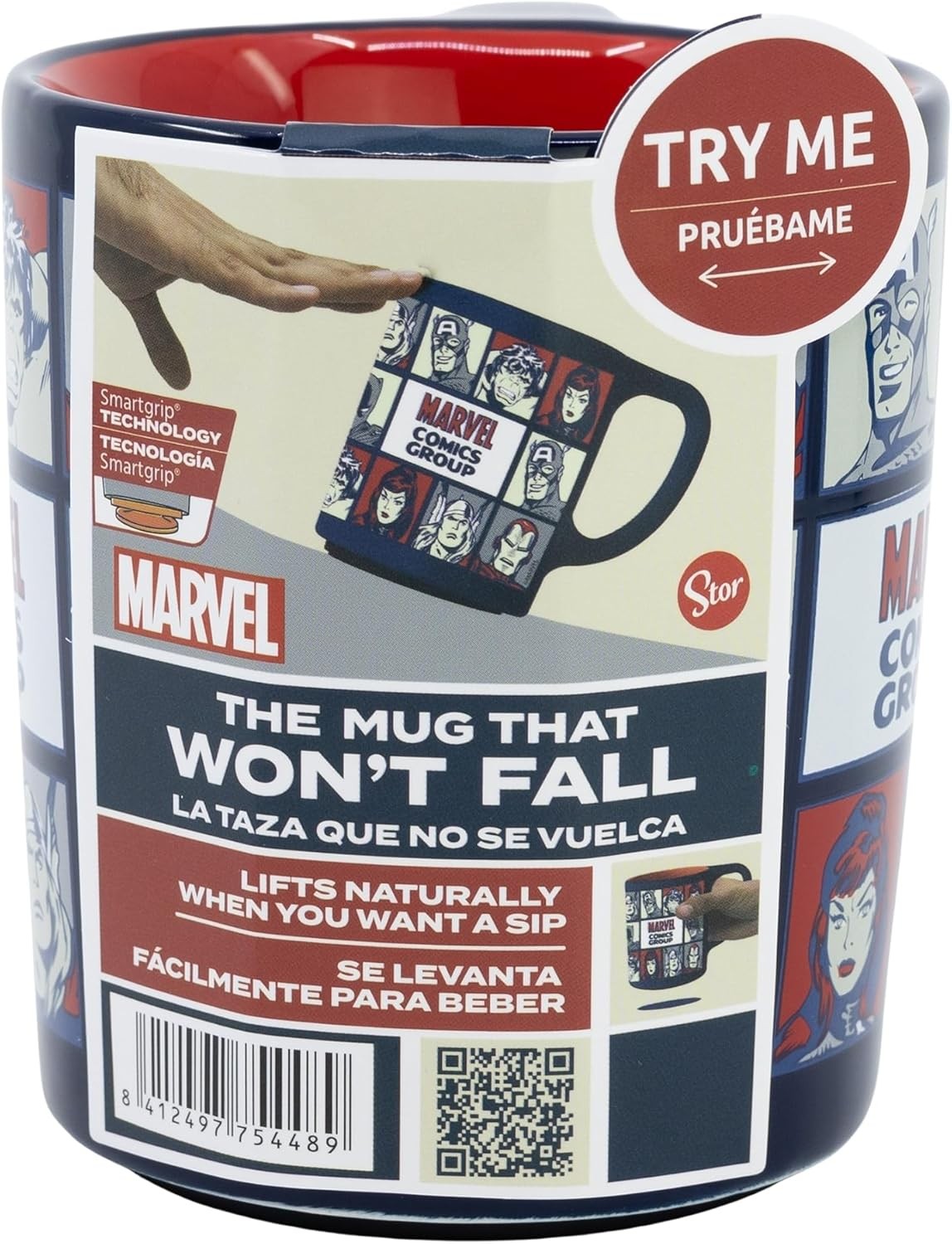 Despierta a tu superhéroe interior con la Taza Antivuelco Superhéroes Clásicos Marvel Cómics de cerámica de 380 ml, una pieza que combina acción, estilo y tecnología. Decorada con los héroes más legendarios del universo Marvel, esta taza es un homenaje a los cómics clásicos que marcaron generaciones. Cada detalle del diseño transmite fuerza, energía y ese toque nostálgico que todo fan del cómic aprecia. Pero no se trata solo de estilo: esta taza cuenta con tecnología SmartGrip, lo que significa que no se vuelca fácilmente. Su base especial se adhiere firmemente a las superficies lisas, evitando accidentes y derrames, incluso en las batallas más intensas del escritorio o la mesa de trabajo. Levántala con facilidad, pero olvídate de los sustos por café derramado. Fabricada en cerámica de alta calidad, mantiene tu bebida a la temperatura ideal y es completamente apta para lavavajillas, garantizando comodidad y durabilidad en cada uso. Con una capacidad de 330 ml, es perfecta para acompañarte en tus mañanas heroicas o en tus tardes de lectura de cómics. Dale poder a tus rutinas y convierte cada sorbo en una pequeña victoria digna de un auténtico Vengador.