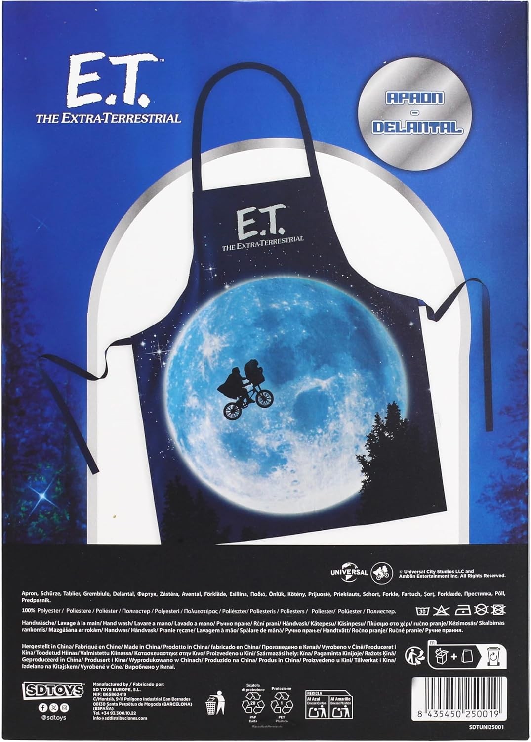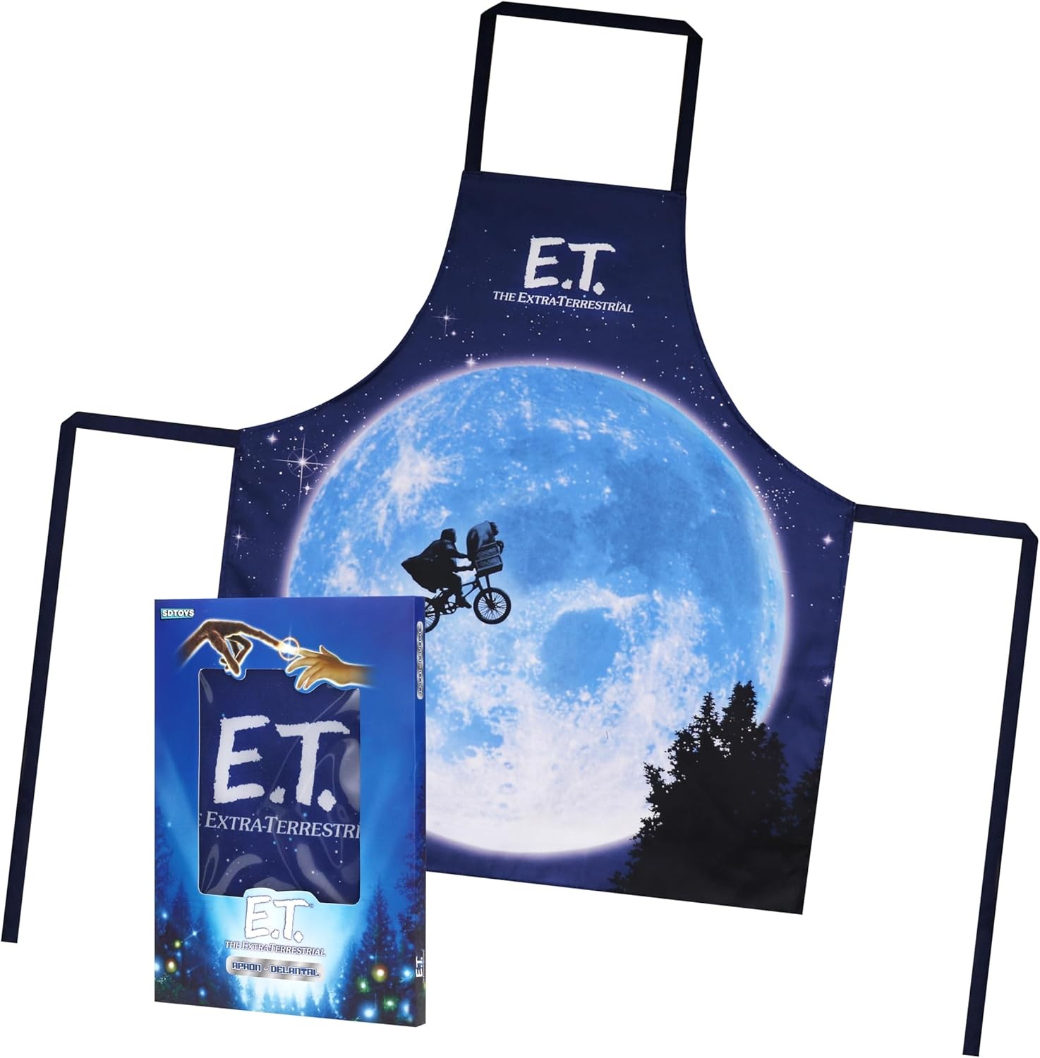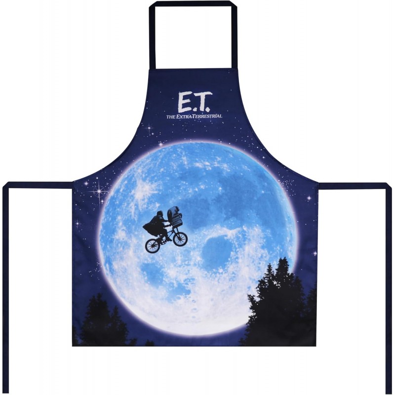 Este Delantal E.T. El Extraterrestre rinde homenaje a una de las imágenes más icónicas de la historia del cine: Elliott y E.T. atravesando la luna en bicicleta, una escena que marcó a generaciones enteras. El delantal reproduce esta estampa mítica con gran detalle, convirtiéndose en una pieza perfecta para fans del cine clásico, coleccionistas y amantes de la obra de Spielberg. Fabricado en material resistente (poliéster) y cómodo para el uso diario, es ideal para cocinar, barbacoas, fiestas temáticas o simplemente para añadir un toque de nostalgia a la cocina. Un artículo imprescindible para quienes quieren llevar consigo un pedazo de magia cinematográfica.