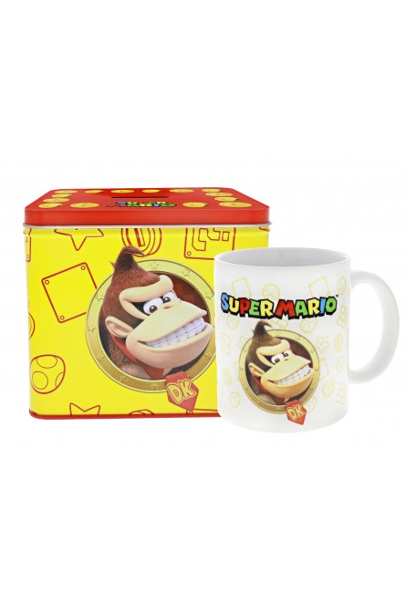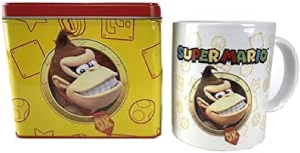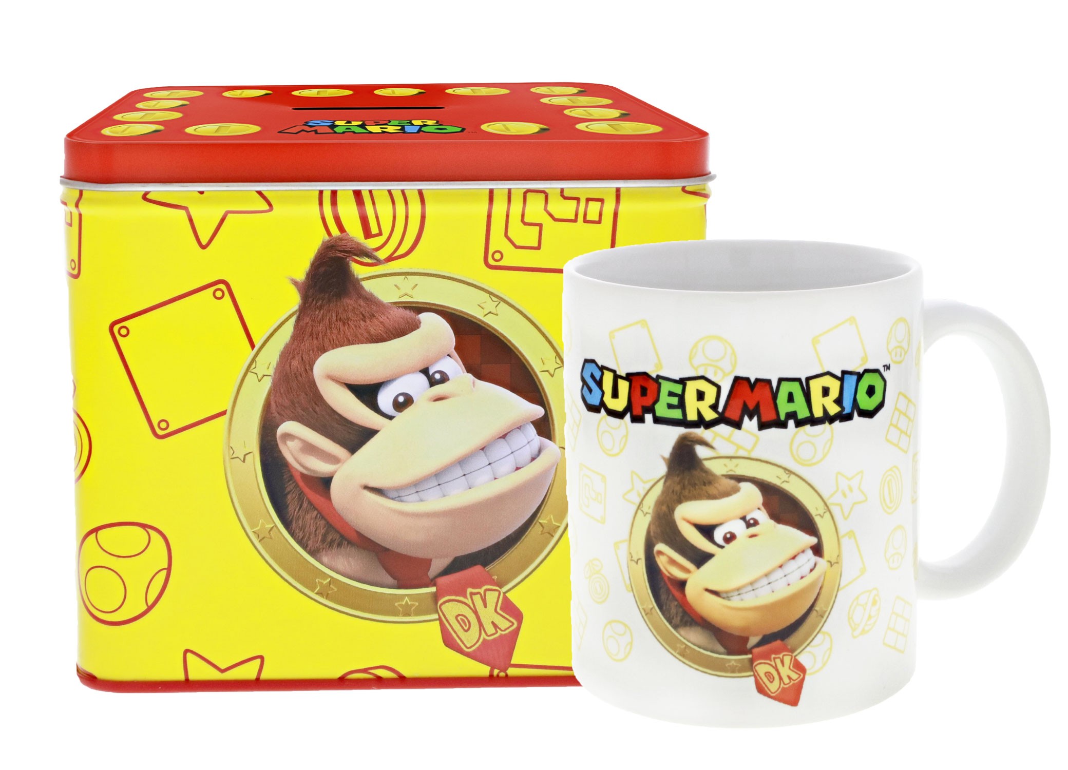 ¡Guarda tus tesoros y sacia tu sed con Donkey Kong! El gorila más saltimbanqui y divertido del vasto universo de Nintendo va a ser tu nuevo escudero y cuidador. Con su hucha metálica podrás guardar todas las monedas que Super Mario Bros vaya poniendo en tu camino, y con la taza de cerámica y 315 mls de capacidad, tu sed desaparecerá como por arte de magia. La taza es apta para lavavajillas, y la hucha viene con tapa.