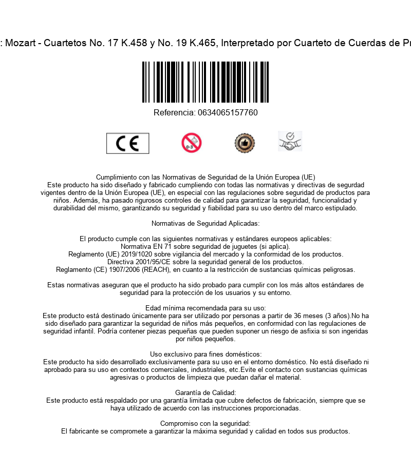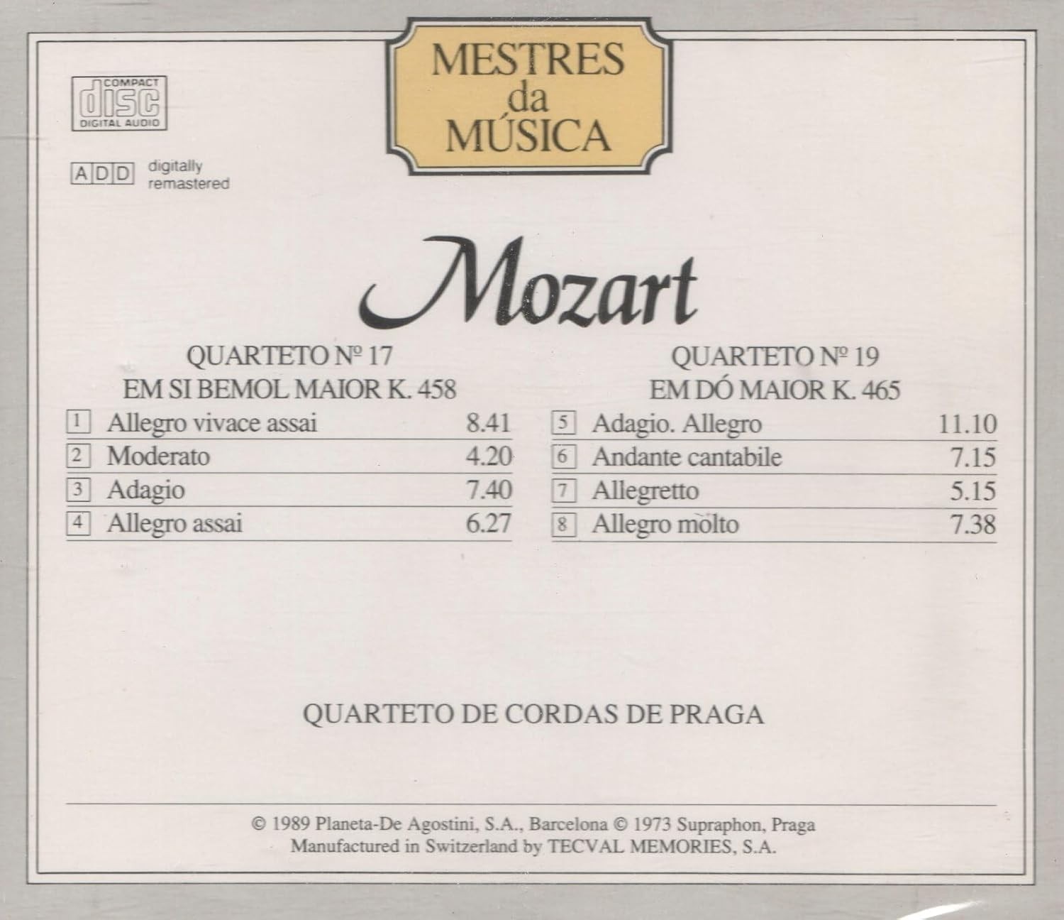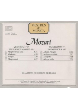 Descubra la exquisita interpretación de dos obras maestras de Mozart por el prestigioso Cuarteto de Cuerdas de Praga en esta edición especial de Mestres da Música. Este disco compacto, digitalizado y remasterizado, presenta los Cuartetos No. 17 en Si bemol mayor K.458 y No. 19 en Do mayor K.465. El Cuarteto No. 17 incluye cuatro movimientos magníficos: un vibrante Allegro vivace assai, seguido por un Moderato expresivo, un profundo Adagio y un brillante Allegro assai. El Cuarteto No. 19 cautiva con sus cuatro movimientos: comenzando con un Adagio-Allegro conmovedor, seguido por un lírico Andante cantabile, un gracioso Allegretto y culminando con un impresionante Allegro molto. Esta grabación, producida por Planeta-Agostini en colaboración con Supraphon Praga, ofrece una experiencia musical excepcional para los amantes de la música clásica y especialmente de las obras de cámara de Mozart.