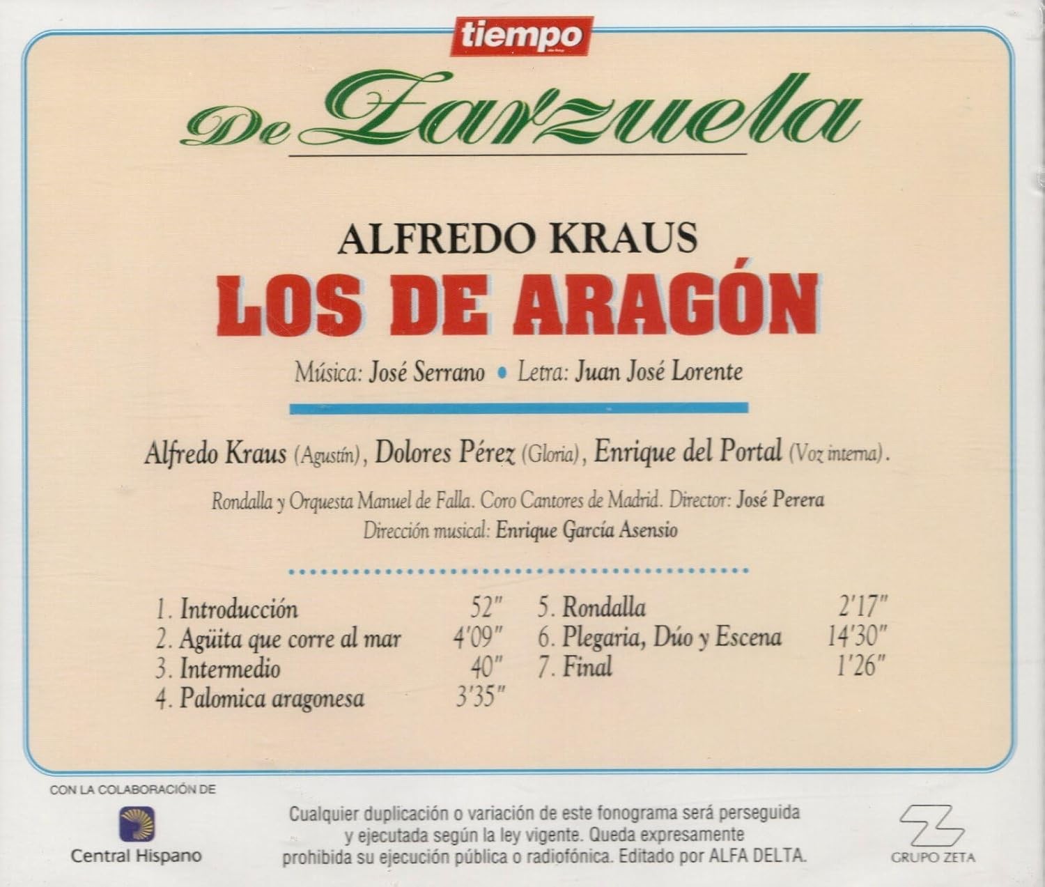 Descubre la magia de la zarzuela española con esta magnífica interpretación de 'Los de Aragón', una obra maestra del género lírico español. Esta grabación presenta la extraordinaria voz del tenor en una producción musical dirigida por José Perera con la Rondalla y Orquesta Manuel de Falla y el Coro Cantores de Madrid, bajo la dirección musical de Enrique García Asensio. La obra, con música del reconocido José Serrano y letra de Juan José Lorente, incluye siete piezas memorables, desde la emotiva 'Introducción' hasta el vibrante 'Final', pasando por joyas como 'Agüita que corre al mar' y la conmovedora 'Plegaria, Dúo y Escena'. Esta grabación captura la esencia de la tradición musical aragonesa, ofreciendo más de 25 minutos de auténtica zarzuela española. Una pieza imprescindible para los amantes del género lírico y la música clásica española.