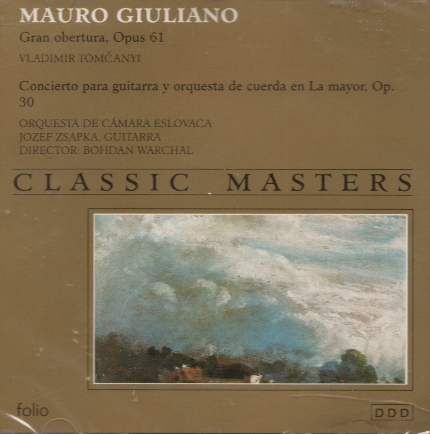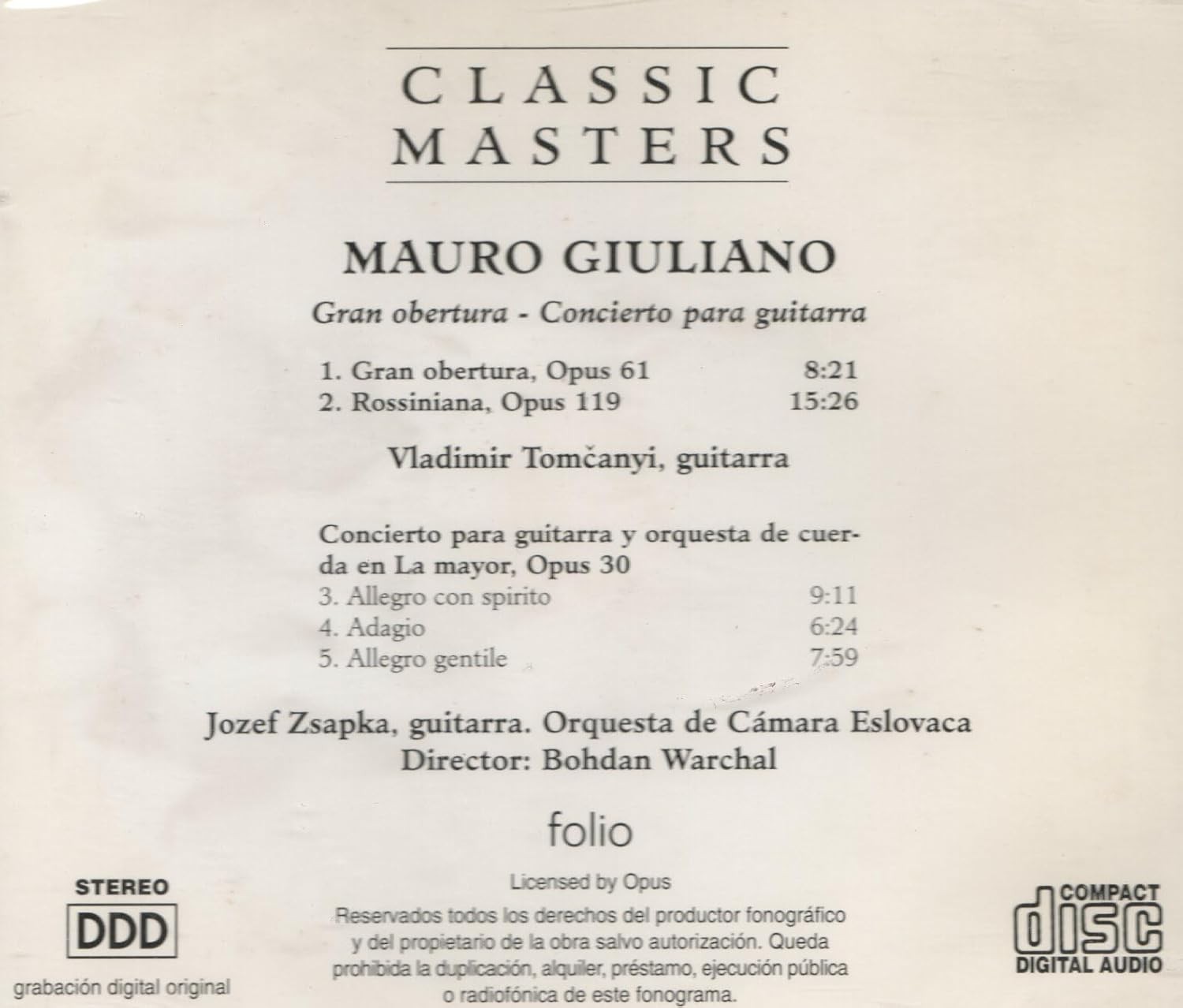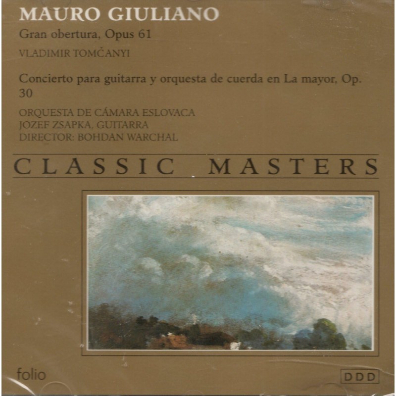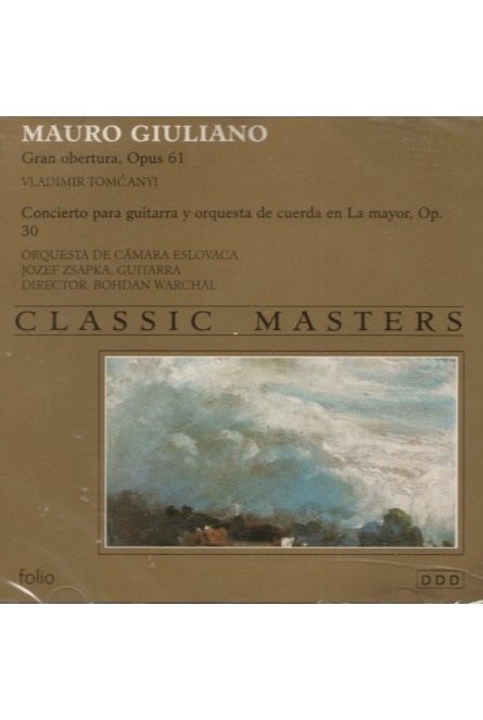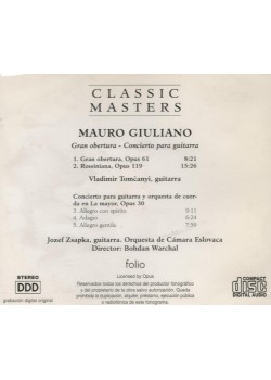 Descubra la majestuosidad de la música clásica con esta exquisita grabación de la colección Classic Masters. Este álbum presenta obras maestras de Mauro Giuliano, incluyendo su impresionante Gran obertura, Opus 61 y Rossiniana, Opus 119, interpretadas magistralmente por Vladimir Tomcanyi en la guitarra. El programa continúa con el Concierto para guitarra y orquesta de cuerda en La mayor, Opus 30, una obra en tres movimientos que destaca por su Allegro con spirito, Adagio y Allegro gentile. La interpretación está a cargo del virtuoso guitarrista Jozef Zsapka, acompañado por la Orquesta de Cámara Eslovaca bajo la dirección de Bohdan Warchal. Esta grabación digital estéreo captura la delicadeza y la profundidad de estas composiciones clásicas, ofreciendo una experiencia auditiva excepcional para los amantes de la música clásica y la guitarra.