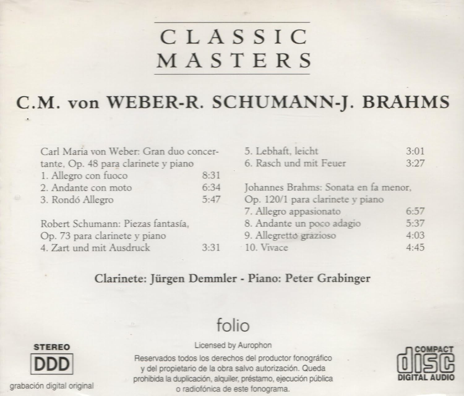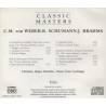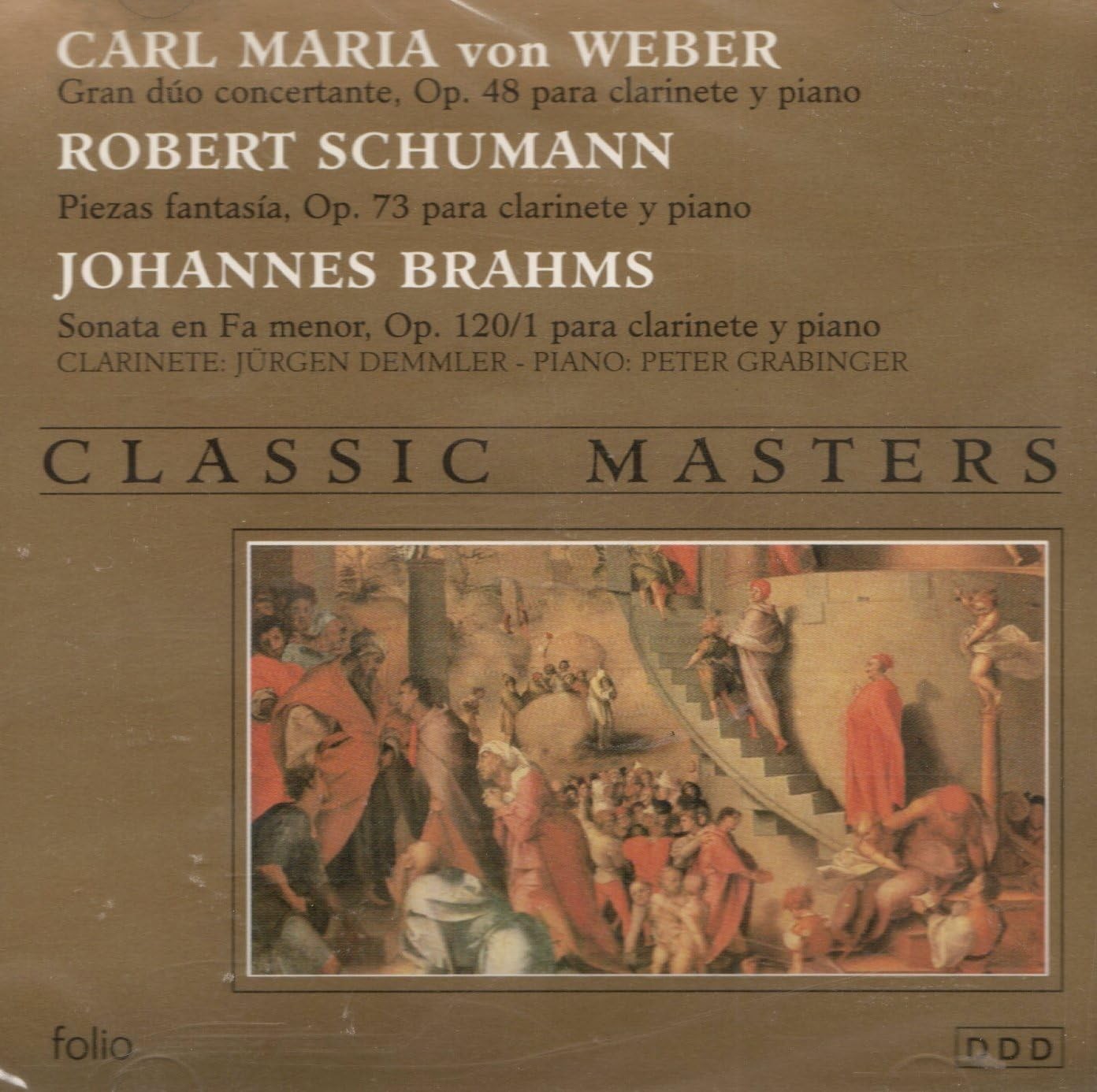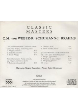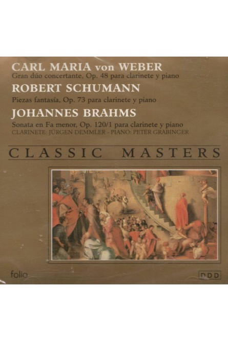Descubre la exquisita colección 'Classic Masters' que reúne tres obras maestras para clarinete y piano de los más destacados compositores románticos alemanes. Este álbum presenta el Gran dúo concertante Op. 48 de Carl Maria von Weber, las evocadoras Piezas fantasía Op. 73 de Robert Schumann, y la emotiva Sonata en Fa menor Op. 120/1 de Johannes Brahms. Interpretado magistralmente por el clarinetista Jürgen Demmler y el pianista Peter Grabinger, cada pieza demuestra la profunda expresividad y virtuosismo técnico característicos del período romántico. El programa incluye diez movimientos que abarcan desde el apasionado 'Allegro con fuoco' de Weber hasta el vibrante 'Vivace' de Brahms, ofreciendo más de 50 minutos de música sublime. Una grabación digital de alta calidad que captura la íntima interacción entre el clarinete y el piano, ideal para los amantes de la música de cámara y coleccionistas de música clásica.