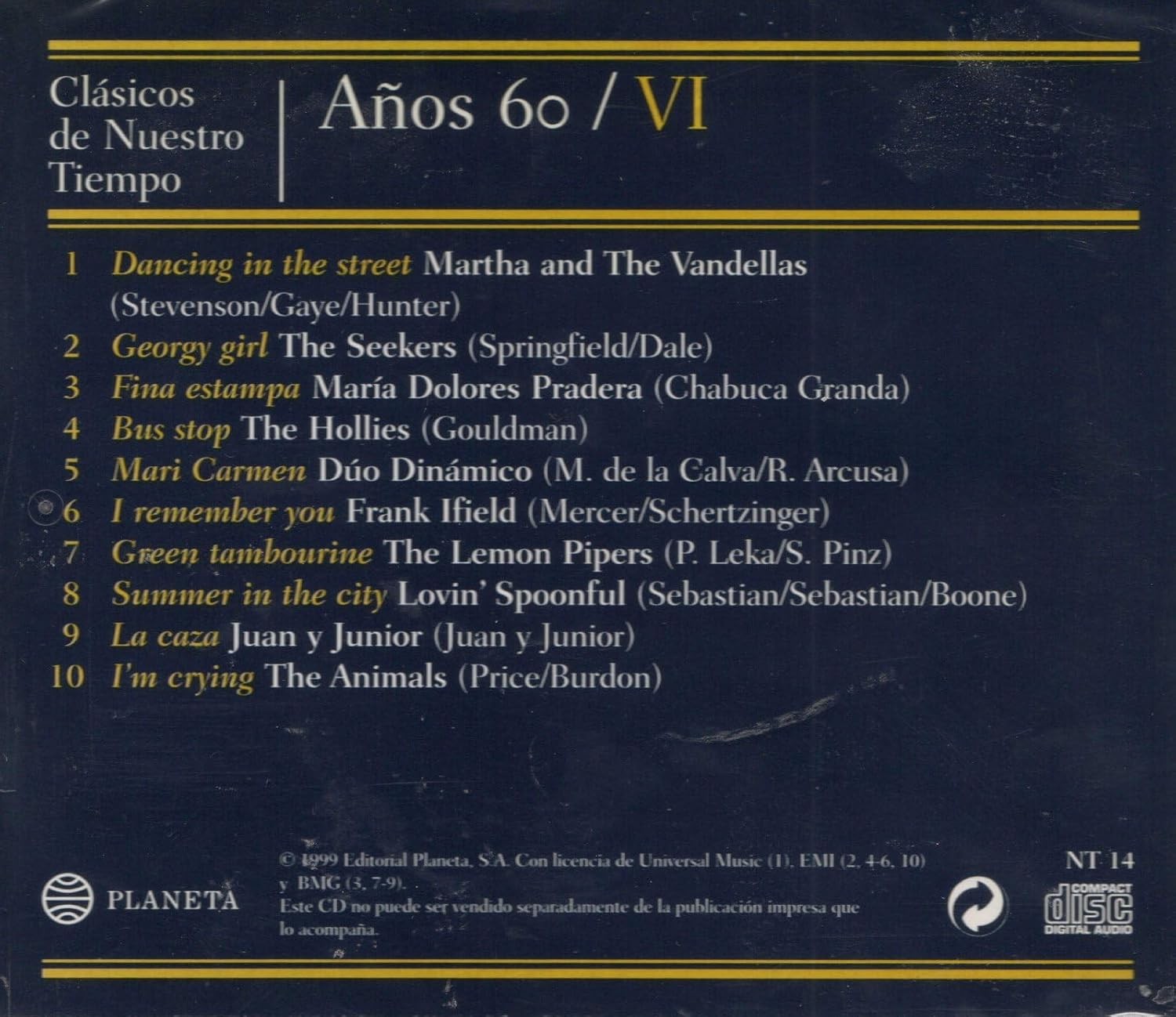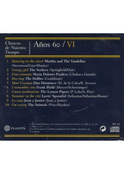 Sumérgete en la nostalgia musical de los años 60 con esta excepcional colección 'Clásicos de Nuestro Tiempo' de Planeta. Este álbum recopilatorio presenta 10 temas emblemáticos que definieron una época dorada de la música, incluyendo éxitos internacionales como 'Dancing in the Street' de Martha and The Vandellas, 'Georgy Girl' de The Seekers, y clásicos en español como 'Fina estampa' de María Dolores Pradera. La colección combina magistralmente géneros diversos, desde el pop británico de The Animals con 'I'm Crying' hasta la música latina con 'La caza' de Juan y Junior. Cada pista ha sido cuidadosamente seleccionada para ofrecer un viaje musical auténtico por los sonidos más representativos de la década. Este CD, parte de una serie más amplia, representa una cuidada selección musical que captura la esencia y la diversidad de los años 60, ideal para coleccionistas y amantes de la música clásica de esta época inolvidable.