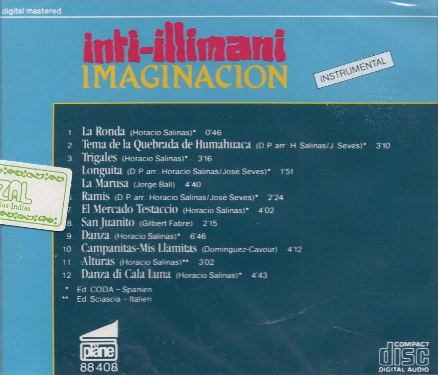 Descubre 'Imaginación', un álbum instrumental magistral de Inti-Illimani que captura la esencia de la música andina en una colección digitalmente masterizada. Este CD presenta doce composiciones instrumentales únicas que fusionan melodías tradicionales con arreglos contemporáneos. Con piezas destacadas como 'La Ronda', 'Tema de la Quebrada de Humahuaca' y 'Danza di Cala Luna', el álbum ofrece un viaje musical a través de los paisajes sonoros de Sudamérica. Las composiciones, principalmente de Horacio Salinas, demuestran la maestría instrumental del grupo y su profunda conexión con las raíces musicales andinas. La producción digital realza la claridad de los instrumentos tradicionales, creando una experiencia auditiva envolvente. Con una duración total que supera los 40 minutos, cada pieza está cuidadosamente elaborada para transportar al oyente a través de diferentes estados de ánimo y texturas musicales, desde melodías contemplativas hasta ritmos más dinámicos y festivos.