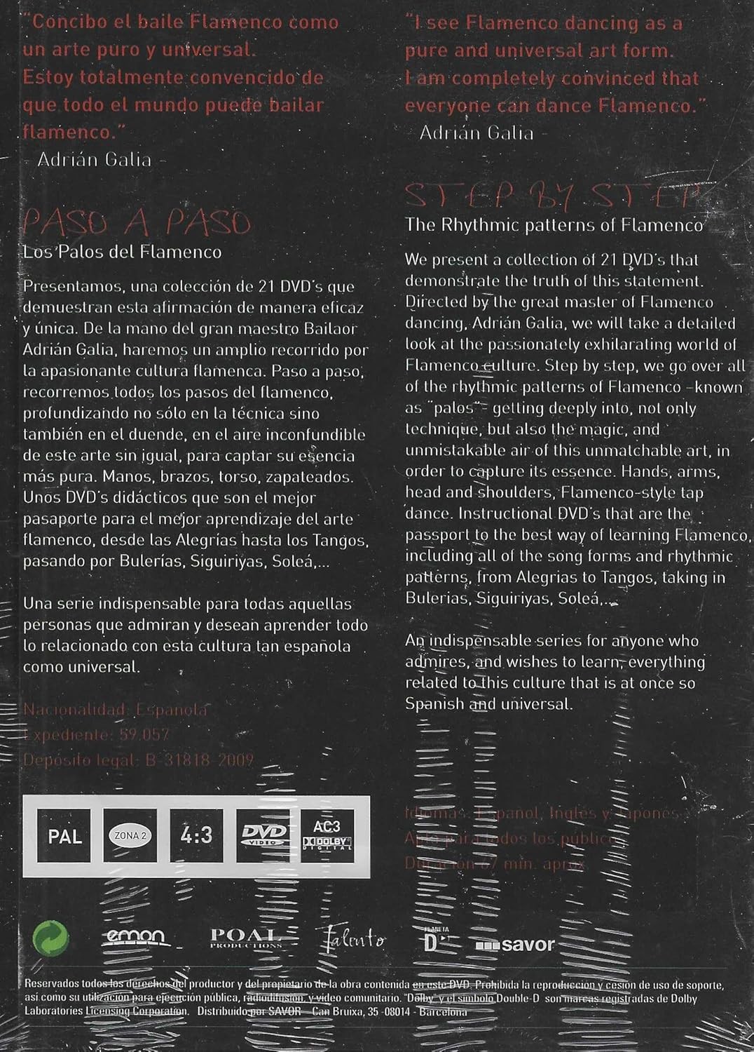 Tangos - Los Palos del Flamenco Vol. 7 es un DVD instructivo excepcional que forma parte de la colección exclusiva de 21 DVDs dirigida por el gran maestro Adrián Galia. Este volumen se centra específicamente en los Tangos, uno de los palos fundamentales del flamenco. La serie completa explora de manera profunda y detallada los patrones rítmicos del flamenco, conocidos como "palos", capturando no solo la técnica sino también la magia y el aire inconfundible de este arte universal. Este DVD didáctico es el pasaporte perfecto para aprender flamenco de manera auténtica, abarcando manos, brazos, torso, zapateados y movimientos de cabeza y hombros característicos del estilo flamenco. Ideal para todas aquellas personas que admiran y desean aprender todo lo relacionado con esta cultura tan española y universal. Un recurso indispensable para comprender la esencia pura del baile flamenco, desde las Alegrías hasta los Tangos, pasando por Bulerías, Siguiriyas y Soleá.