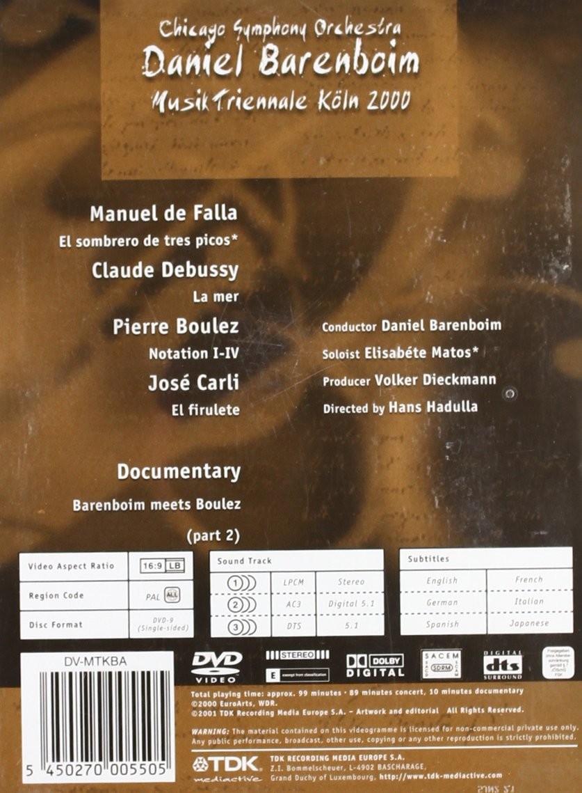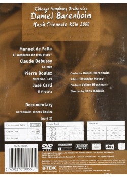 Daniel Barenboim dirige la Orquesta Sinfónica de Chicago en esta actuación de la Musik Triennale Koln 2000. Las piezas interpretadas incluyen 'El Sombrero de Tres Picos' de Manuel de Falla, 'La Mer', 'Notation I-IV' de Boulez y 'El Firulete' de José Carli. También cuenta con la segunda parte del documental 'Barenboim Meets Boulez', la primera parte del cual se puede encontrar en 'Musik Triennale Koln 2000: Pierre Boulez & Christine Schafer'.