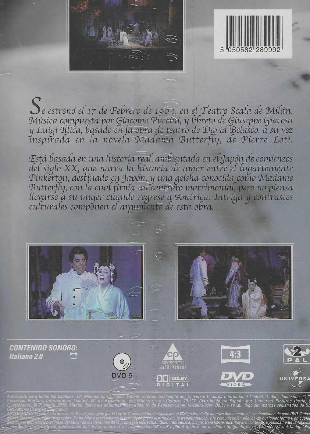 Esta edición en DVD de La Opera Madame Butterfly presenta la versión de José Luis Moreno de una de las obras maestras más conmovedoras de Giacomo Puccini. Estrenada el 17 de febrero de 1904 en el Teatro Scala de Milán, esta ópera cuenta con música compuesta por Puccini y libreto de Giuseppe Giacosa y Luigi Illica, basado en la obra de teatro de David Belasco, inspirada a su vez en la novela Madama Butterfly de Pierre Loti. La historia se desarrolla en el Japón de comienzos del siglo XX y narra el trágico romance entre el teniente estadounidense Pinkerton y la geisha Madame Butterfly, quien firma un contrato matrimonial con él pero es abandonada cuando regresa a América. Esta producción captura la intriga y los contrastes culturales que componen el argumento de esta obra clásica. El DVD incluye contenido sonoro en italiano 2.0 con formato de imagen 4:3 y tecnología Dolby Digital. Una experiencia operística imprescindible para los amantes de la música clásica y el teatro lírico.