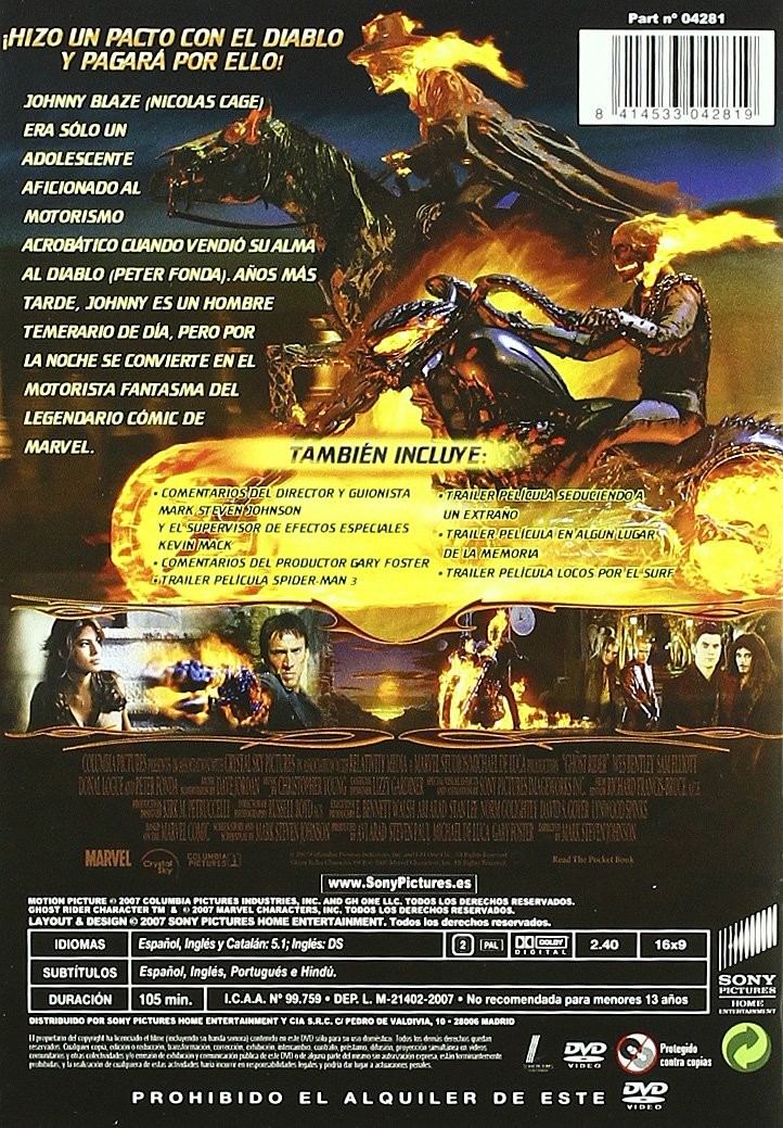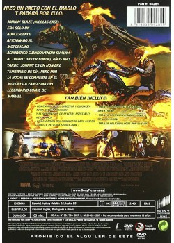 De Marvel Comics, de los creadores de Spider-Man, Los Cuatro Fantásticos y X-Men, llega un nuevo héroe... Ghost Rider. Hace mucho tiempo, la superestrella de las acrobacias en moto, Johnny Blaze (Nicolas Cage) hizo un trato con el diablo para proteger a los que más quería: su padre y su novia de la juventud, Roxanne (Eva Mendes). Ahora, el diablo ha venido a cobrar su deuda. De día, Johnny es un motero acróbata temerario... pero de noche, en presencia del diablo, se convierte en Ghost Rider, un cazarecompensas de demonios deshonestos. Obligado a hacer la voluntad del diablo, Johnny está decidido a enfrentarse a su destino y utilizar su maldición y sus poderes para defender al inocente.