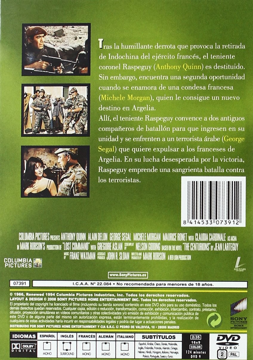 https://back.dvdstorespain.es/es/peliculas/112840-mando-perdido-dvd--8414533073912.html112840Mando Perdido [DVD] (1966) Lost CommandAl teniente coronel Pierre Raspegury (Anthony Quinn), jefe de una división paracaidista del ejército francés derrotada en Vietnam, le comunican que ha sido relevado de su puesto y que su regimiento ha sido disuelto. Gracias a las influencias de la Condesa viuda De Clairefons (Michèle Morgan), consigue un nuevo destino en Argelia en una misión de paz. Ella le promete que se casará con él si vuelve convertido en general. Sin embargo, lo que hace Raspegury es intentar persuadir al capitán Esclavier (Alain Delon) y a otros camaradas para vengar juntos la humillación sufrida en Vietnam. https://dvdstorespain.es/1069893-home_default/mando-perdido-dvd-.jpg4.6281instock4.62814.6281002025-07-08T15:07:04+0200/Inicio/Inicio/DVD/Inicio/Películas/Inicio/Nuevos/Inicio/Homenaje a Claudia Cardinale
