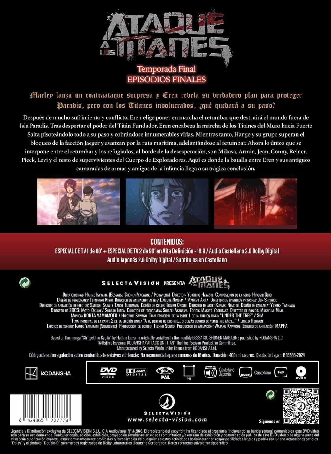 https://back.dvdstorespain.es/es/peliculas/120005-ataque-a-los-titanes-los-capitulos-finales-dvd-2023-shingeki-no-kyojin-8424365727778.html120005Ataque a los Titanes (Los capítulos finales) [DVD] (2023) Shingeki no KyojinDespués de mucho sufrimiento y conflicto, Eren elige poner en marcha el retumbar que destruirá el mundo fuera de Isla Paradis. Tras despertar el poder del Titán Fundador, Eren encabeza la marcha de los Titanes del Muro hacia Fuerte Salta pisoteándolo todo a su paso y cobrándose innumerables vidas. Mientras tanto, Hange y su grupo superan el bloqueo de la facción Jaeger y avanzan por la ruta marítima, adelantándose al retumbar. Ahora lo único que se interpone entre el retumbar y los refugiados, al borde de la desesperación, son Mikasa, Armin, Jean, Conny, Reiner, Pieck, Levi y el resto de supervivientes del Cuerpo de Exploradores. Aquí es donde la batalla entre Eren y sus antiguos camaradas de armas y amigos de la infancia llega a su trágica conclusión.https://dvdstorespain.es/673796-home_default/ataque-a-los-titanes-los-capitulos-finales-dvd-2023-shingeki-no-kyojin.jpg15.7025instockSELECTA VISION15.702515.7025002024-12-26T22:32:19+0100/Inicio/Inicio/DVD/Inicio/Películas/Inicio/Nuevos