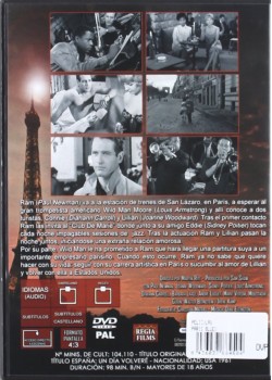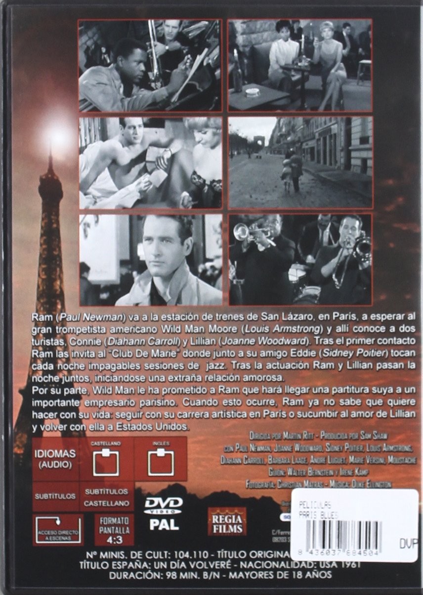España Edition, PAL/Region 0 DVD: IDIOMAS: Español ( Dolby Digital 2.0 ), Inglés ( Dolby Digital 2.0 ), Español ( Subtitulos ), EXTRAS: Acceso De la Escena, Menú Interactivo, SYNOPSIS: Ram (Paul Newman) va a la estación de trenes de San Lázaro, en París, a esperar al trompetista americano Wild Man Moore (Louis Armstrong) y allí conoce a dos turistas, Connie (Diahann Carroll) y Lillian (Joanne Woodward). Tras el primer contacto Ram las invita al 'Club de Marie' donde junto a su amigo Eddie (Sidney Poitier) tocan cada noche juntos, iniciándose una extraña relación amorosa. Por su parte Wild Man le ha prometido a Ram que hará llegar una partitura suya a un importante empresario parisino. Cuando esto ocurre, Ram ya no sabe que quiere hacer con su vida: seguir con su carrera artística en París o sucumbir al amor de Lillian y volver con ella a Estados Unidos... APANTALLADO/ADJUDICADO EL: Concesiones De la Academia De Oscar, ...Paris Blues (SP)