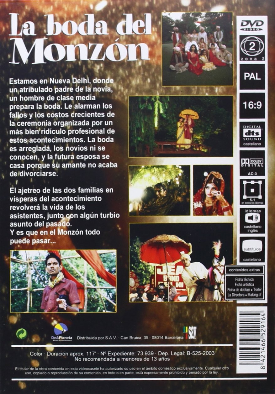 https://back.dvdstorespain.es/es/peliculas/123221-la-boda-del-monzon-dvd--8421466529164.html123221La Boda Del Monzón [DVD] (2001) Monsoon WeddingLos preparativos de una elegante boda en Nueva Delhi, que durará cuatro días, reflejan los conflictos entre generaciones partidarias de seguir las tradiciones y otras defensoras de la modernidad. A Lalit Verma y a su mujer Pimmi la boda concertada de su hija les lleva casi al borde de un ataque de nervios y de la quiebra. Otras historias paralelas se desarrollan a medida que van llegando a la ciudad parientes procedentes de todo el mundo. El novio llega de Houston (Texas), donde trabaja como ingeniero, para conocer a la novia. La novia, por su parte, acepta el compromiso a regañadientes, pues está enamorada de un presentador de televisión. Los preparativos de la boda exigen contratar a un organizador profesional y el elegido será P.K. Dubey, que es un inteligente joven de clase media. https://dvdstorespain.es/755875-home_default/la-boda-del-monzon-dvd-.jpg4.6281instockDEAPLANETA4.62814.6281002025-05-30T05:46:31+0200/Películas