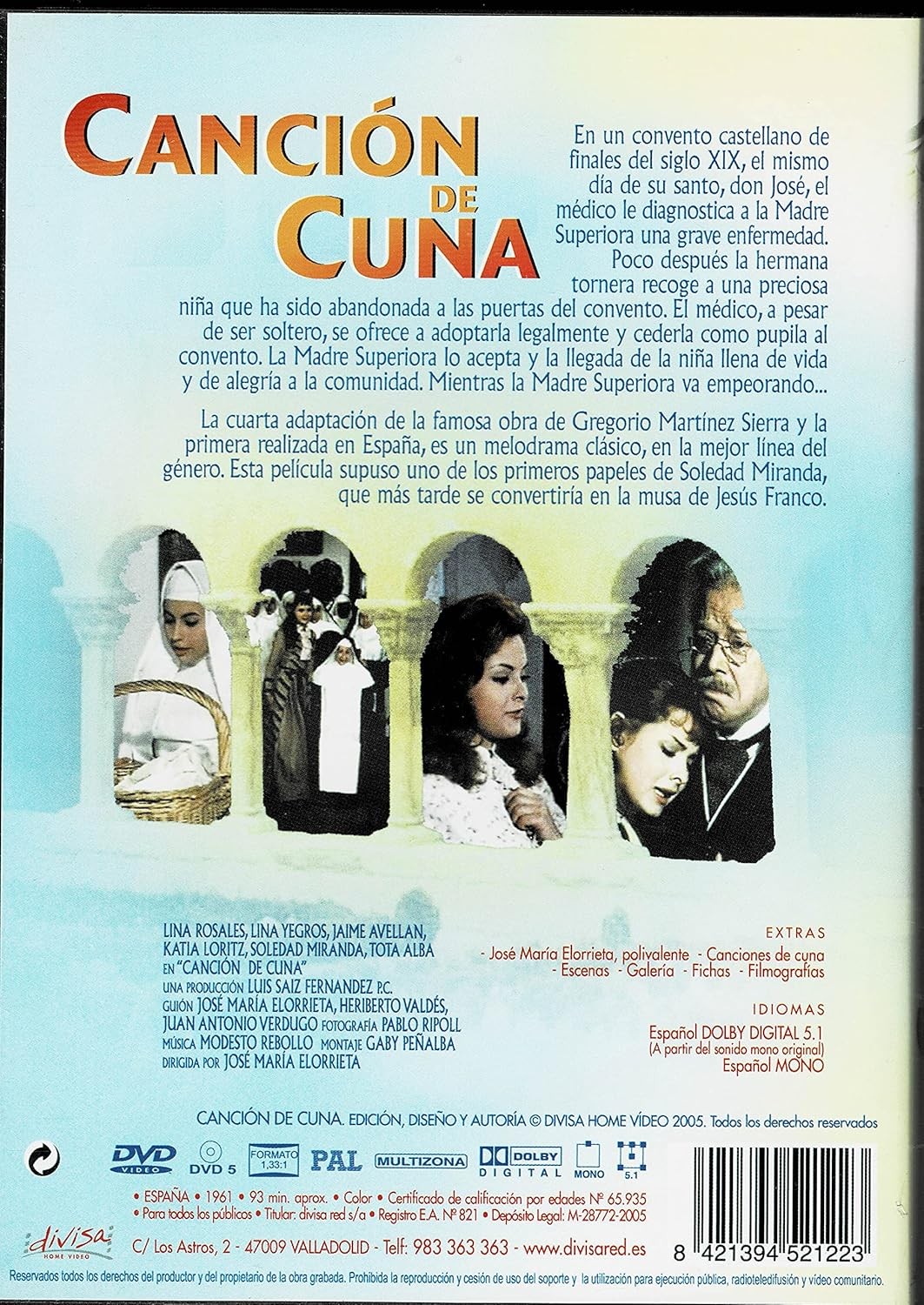 https://back.dvdstorespain.es/es/peliculas/123424-cancion-de-cuna-dvd--8421394521223.html123424Canción De Cuna [DVD] (1961)En un convento castellano de finales del siglo XIX, la comunidad de monjas de clausura celebra la onomástica de su superiora obsequiándola con una poesía. También recibe la visita del médico, don José, que le diagnostica una enfermedad con mal pronóstico. Poco después la hermana tornera recoge una preciosa niña que ha sido abandonada a las puertas del convento y el médico, a pesar de ser soltero, se ofrece a adoptarla legalmente y cederla como pupila al convento. https://dvdstorespain.es/760133-home_default/cancion-de-cuna-dvd-.jpg9.9174instock9.91749.9174002025-06-02T23:34:11+0200/Inicio/Inicio/DVD/Inicio/Películas/Inicio/Nuevos