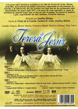 https://back.dvdstorespain.es/es/peliculas/124216-pack-teresa-de-jesus-dvd--8421394523395.html124216Teresa De Jesús (3 discos) [DVD] (1984)Serie de TV (1984). 8 episodios. Con gran rigor histórico asistimos a la vida de Teresa de Jesús, monja carmelita, descendiente de judíos conversos, que emprendió la reforma de la Orden. En sus escritos nos dejó uno de los testimonios más apasionantes del siglo XVI. https://dvdstorespain.es/818588-home_default/pack-teresa-de-jesus-dvd-.jpg13.2231instockDivisa HV13.223113.2231002025-07-03T19:30:27+0200/Inicio/Inicio/DVD/Inicio/Películas/Inicio/Nuevos