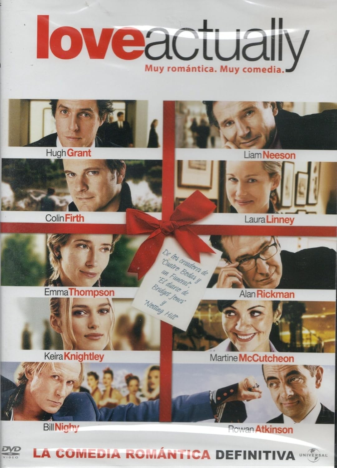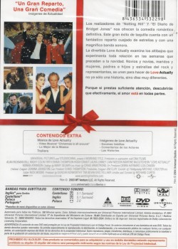 Love Actually, la comedia romántica definitiva, llega en formato DVD de la mano de Universal Pictures. Esta encantadora película entrelaza diez historias diferentes que exploran los altibajos del amor durante la época navideña. Con un elenco estelar y una magnífica banda sonora, la película examina las relaciones entre novios, esposos, padres e hijos y estrellas del rock. El DVD incluye contenido extra excepcional como escenas inéditas, el video musical 'Christmas is all around', comentarios de los actores y las historias detrás de cada personaje. Disponible con audio en castellano (5.1 Surround), inglés (5.1 Surround) y polaco (2.0), además de subtítulos en varios idiomas. Esta edición cuenta con una duración aproximada de 130 minutos y está presentada en formato anamórfico 2.35:1 con sonido Dolby Digital. Una película que demuestra que el amor está, efectivamente, en todas partes.