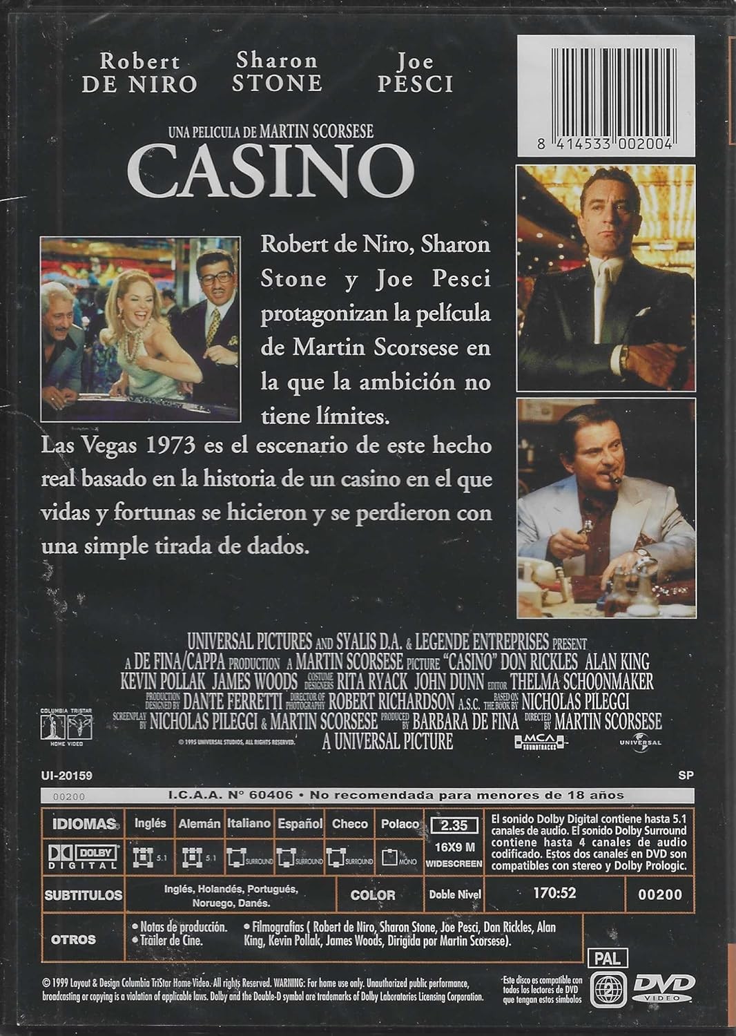 Casino es una obra maestra cinematográfica dirigida por Martin Scorsese que te transporta al fascinante mundo de Las Vegas en 1973. Esta película protagonizada por Robert De Niro, Sharon Stone y Joe Pesci narra una historia real basada en la ambición desmedida y las fortunas que se construyeron y destruyeron con una simple tirada de dados. El DVD incluye audio en múltiples idiomas incluyendo español, inglés, alemán, italiano, checo y polaco, con subtítulos disponibles en varios idiomas. Con una duración de 170 minutos, esta producción de Universal Pictures te sumergirá en un relato donde las vidas y fortunas cambian dramáticamente en el escenario del casino más emblemático de la época. Una experiencia cinematográfica imprescindible que captura la esencia del poder, la codicia y las consecuencias del juego en el mundo del entretenimiento.