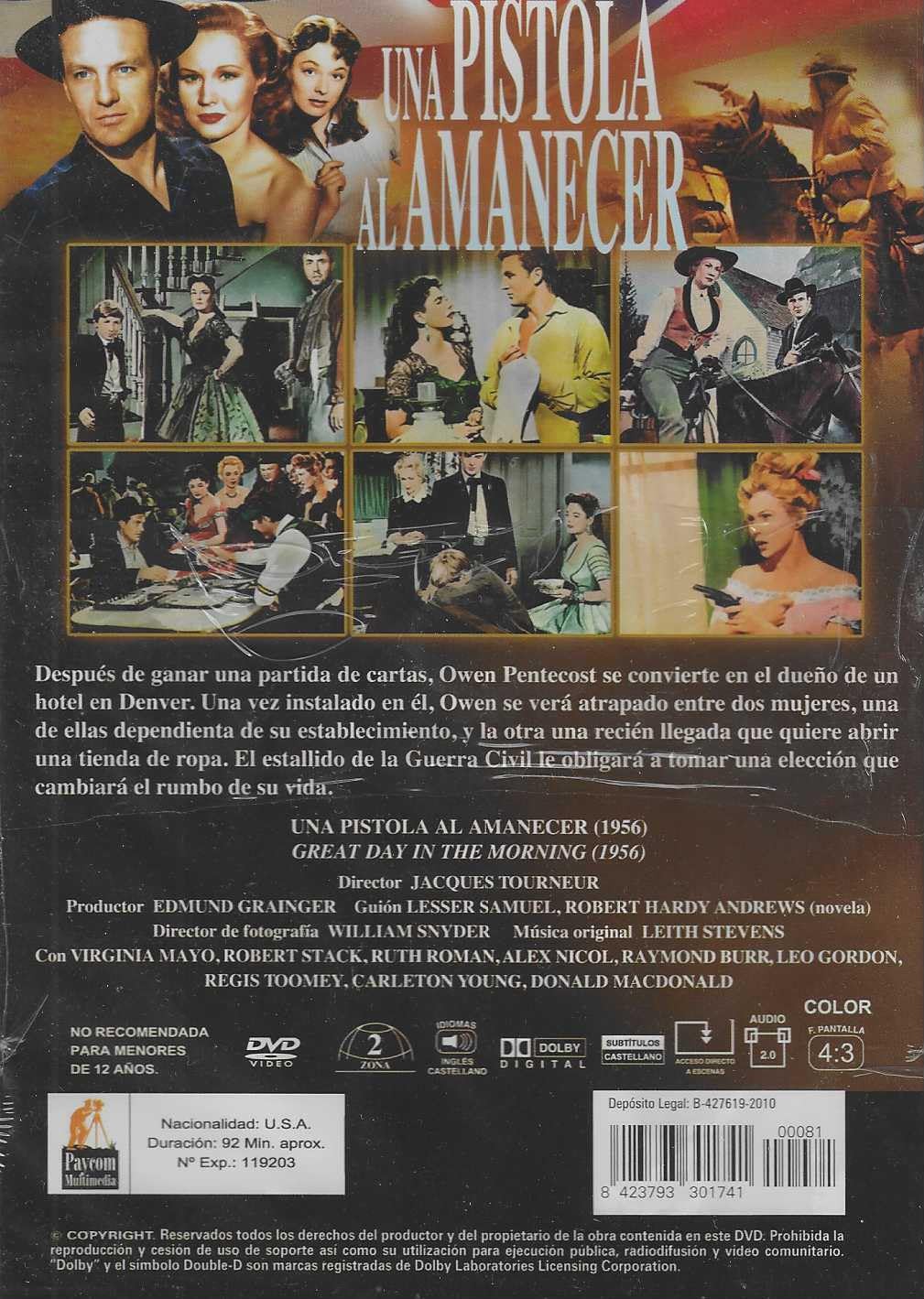 https://back.dvdstorespain.es/es/peliculas/128867-una-pistola-al-amanecer-dvd-edicion-slim-dvd-2024--0634065166113.html128867Una Pistola al Amanecer (Edición Slim) [DVD] (1956) Great Day in the MorningColorado, principios de 1861. En Denver, Owen Pentecost, un pistolero sin escrúpulos, se convierte en el dueño de un hotel tras ganar una partida de cartas. Dos mujeres se enamoran de él: la empleada del saloon del que es propietario y una forastera que ha llegado con la intención de abrir una tienda de ropa femenina. Los conflictos que preceden a la guerra de Secesión (1861-1865) y, finalmente, el estallido de la contienda sitúan a Owen ante un difícil dilema debido a su origen sureño. https://dvdstorespain.es/1120952-home_default/una-pistola-al-amanecer-dvd-edicion-slim-dvd-2024-.jpg5.2893instock5.28935.2893002026-01-22T04:45:10+0100/Inicio/Inicio/DVD/Inicio/Películas/Inicio/Nuevos