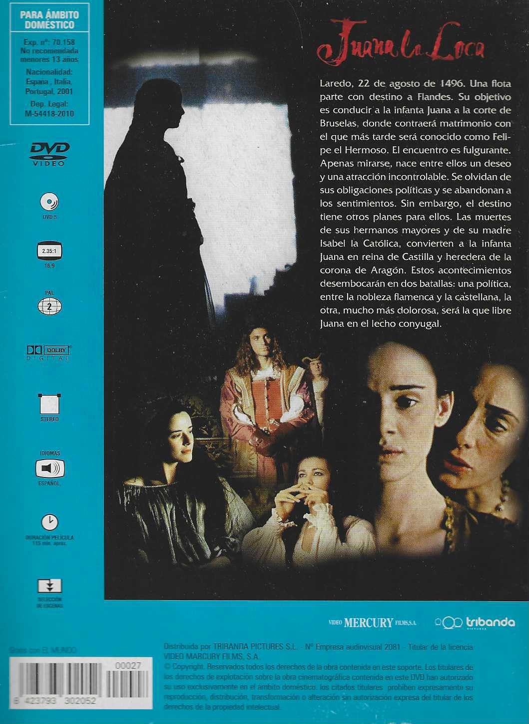 https://back.dvdstorespain.es/es/peliculas/128887-juana-la-loca-dvd-edicion-sobre-dvd-2024--0634065166298.html128887Juana la Loca (Edición sobre) [DVD] (2001)Finales del siglo XV. Isabel la Católica (Susi Sánchez) envía a su hija Juana (Pilar López de Ayala) a Flandes para que se case con Felipe el Hermoso (Liotti). Se trata de un matrimonio de carácter político que sirve para sellar y garantizar una alianza dinástica entre los Reyes Católicos y el emperador de Alemania Maximiliano I, con el fin de aislar a Francia. Siguiendo la misma política, se había concertado el matrimonio de Catalina y Enrique VIII de Inglaterra. Sin embargo, Juana, locamente enamorada de su marido, no podía soportar sus infidelidades; su desmesurado amor desembocaba con frecuencia en terribles y enfermizos ataques de celos. Esta situación unida a las intrigas de la corte contribuyeron a deteriorar la relación matrimonial.https://dvdstorespain.es/1121199-home_default/juana-la-loca-dvd-edicion-sobre-dvd-2024-.jpg5.2893instock5.28935.2893002026-01-23T00:46:54+0100/Inicio/Inicio/DVD/Inicio/Películas/Inicio/Nuevos
