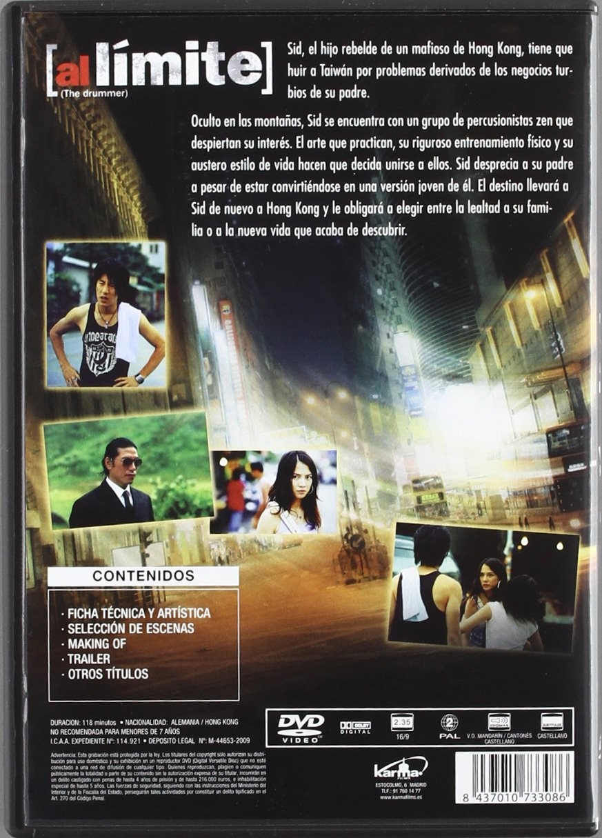 https://back.dvdstorespain.es/es/peliculas/128907-al-limite-dvd-2010--8437010733086.html128907Al Límite [DVD] (2007) Zhan GuSid, hijo de un importante jefe mafioso de Hong Kong, se ve obligado a huir a las montañas de Taiwán. Allí entra en contacto con los miembros de una pequeña comunidad que vive entregada a perfeccionar la mente y el cuerpo mientras se entrenan con dureza y disciplina. Son además, consumados músicos de los tambores zen, un arte milenario que procede de China. Sid llega a ser uno más de esta comunidad, hasta que un día llegan noticias de Hong Kong: su familia está inmersa en una lucha entre bandas y lo necesitan. Sid tendrá que elegir entre la lealtad a los suyos y el sistema de valores recién aprendido. https://dvdstorespain.es/1121785-home_default/al-limite-dvd-2010-.jpg4.6281instock4.62814.6281002026-01-27T19:30:10+0100/Inicio/Inicio/DVD/Inicio/Películas/Inicio/Nuevos