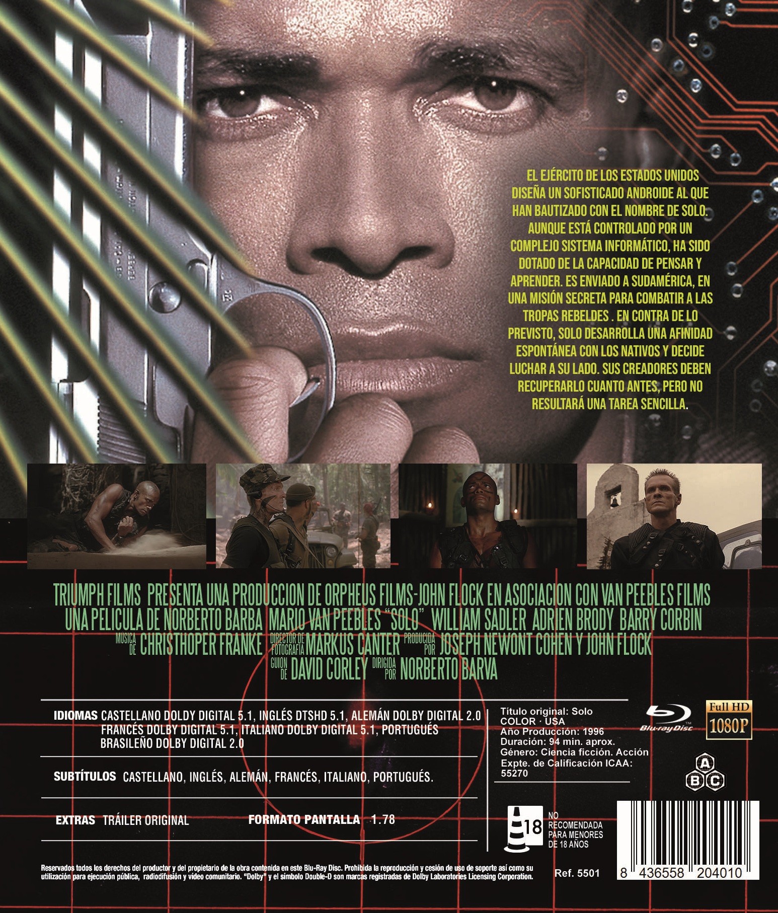 https://back.dvdstorespain.es/es/peliculas/128965-solo-el-destructor-blu-ray-1996-solo-blu-ray-2026--8436558204010.html128965Solo, el Destructor [Blu-ray] (1996) SoloMitad máquina, mitad hombre, fue creado especialmente para matar, pero se escapó de su control. El ejército de los Estados Unidos diseña un sofisticado androide al que han bautizado con el nombre de Solo. Aunque está controlado por un complejo sistema informático, ha sido dotado de la capacidad de pensar y aprender. Es enviado a Sudamérica, en una misión secreta para combatir a las tropas rebeldes (compuestas por indígenas que tan sólo reclaman su libertad). En contra de lo previsto, Solo desarrolla una afinidad espontánea con los nativos y decide luchar a su lado. Sus creadores deben recuperarlo cuanto antes, pero no resultará una tarea sencilla. Filme de acción a la estela de "Robocop" cuya carátula lo explica todo: "Fue diseñado para atacar sin contemplaciones, pero un fallo le hizo entender la crueldad y lo enfrentó a sus creadores...".https://dvdstorespain.es/1123719-home_default/solo-el-destructor-blu-ray-1996-solo-blu-ray-2026-.jpg10.7025instock10.702510.7025002026-01-31T03:15:13+0100/Inicio/Inicio/Blu-ray/Inicio/Películas/Inicio/Nuevos