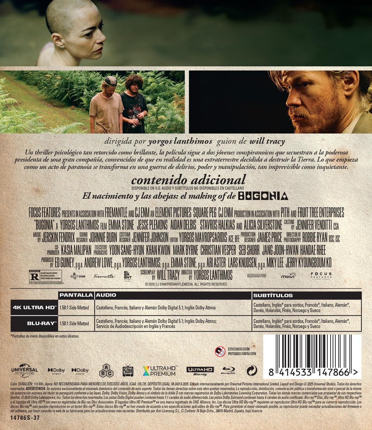 https://back.dvdstorespain.es/es/peliculas/129061-bugonia-4k-uhd-bd-blu-ray-2026--8414533147866.html129061Bugonia [4K UHD, Blu-ray] (2025)Dos jóvenes conspiranoicos secuestran a la poderosa presidenta de una gran compañía, convencidos de que se trata en realidad de una extraterrestre decidida a destruir el planeta Tierra. Remake del film coreano "Save the Green Planet".https://dvdstorespain.es/1124526-home_default/bugonia-4k-uhd-bd-blu-ray-2026-.jpg22.2314instock22.231422.2314002026-02-02T22:30:39+0100/Inicio/Inicio/Películas/Inicio/Nuevos/Inicio/4K-UHD