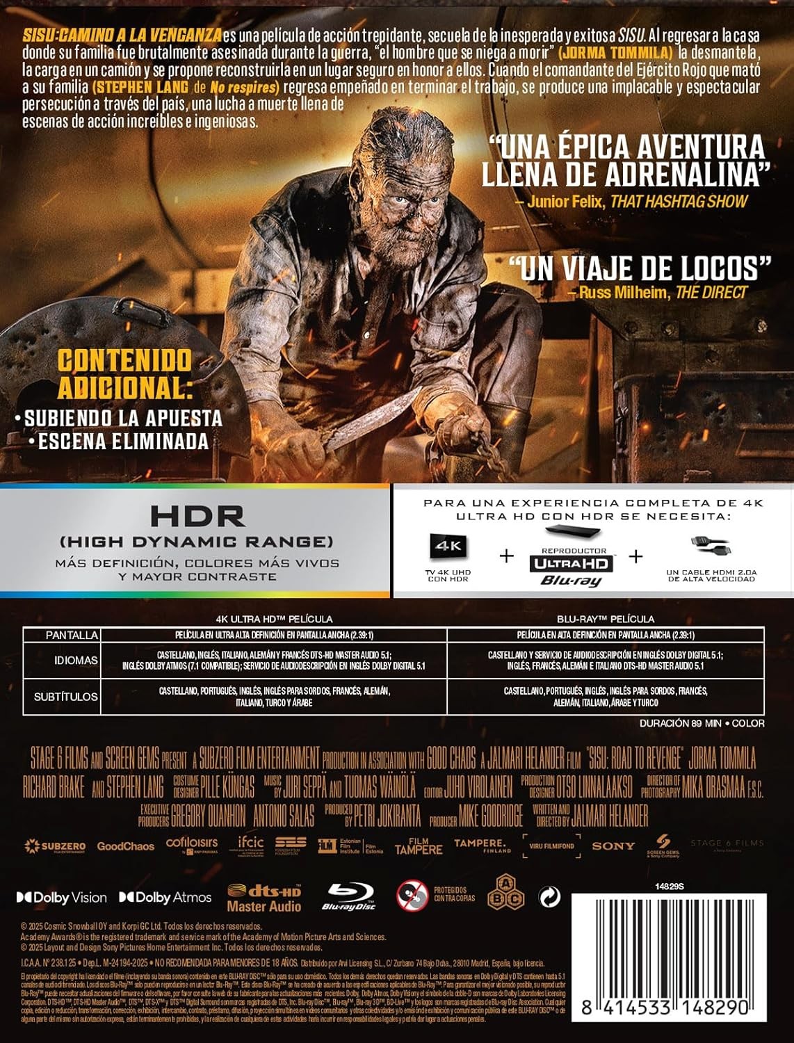 https://back.dvdstorespain.es/es/peliculas/129068-sisu-camino-a-la-venganza-4k-uhd-bd-edicion-metalica-blu-ray-2026--8414533148290.html129068Sisu: Camino a la Venganza (Metal) [4K UHD, Blu-ray] (2025) Sisu 2De vuelta a la casa donde su familia fue brutalmente asesinada durante la guerra, "el hombre que se niega a morir" la desmantela, la carga en un camión y está decidido a reconstruirla en algún lugar seguro en su honor. Cuando el comandante del Ejército Rojo que mató a su familia regresa decidido a terminar el trabajo, se inicia una lucha a muerte. https://dvdstorespain.es/1124540-home_default/sisu-camino-a-la-venganza-4k-uhd-bd-edicion-metalica-blu-ray-2026-.jpg32.9752instock32.975232.9752002026-02-02T22:31:23+0100/Inicio/Inicio/Películas/Inicio/Nuevos/Inicio/4K-UHD