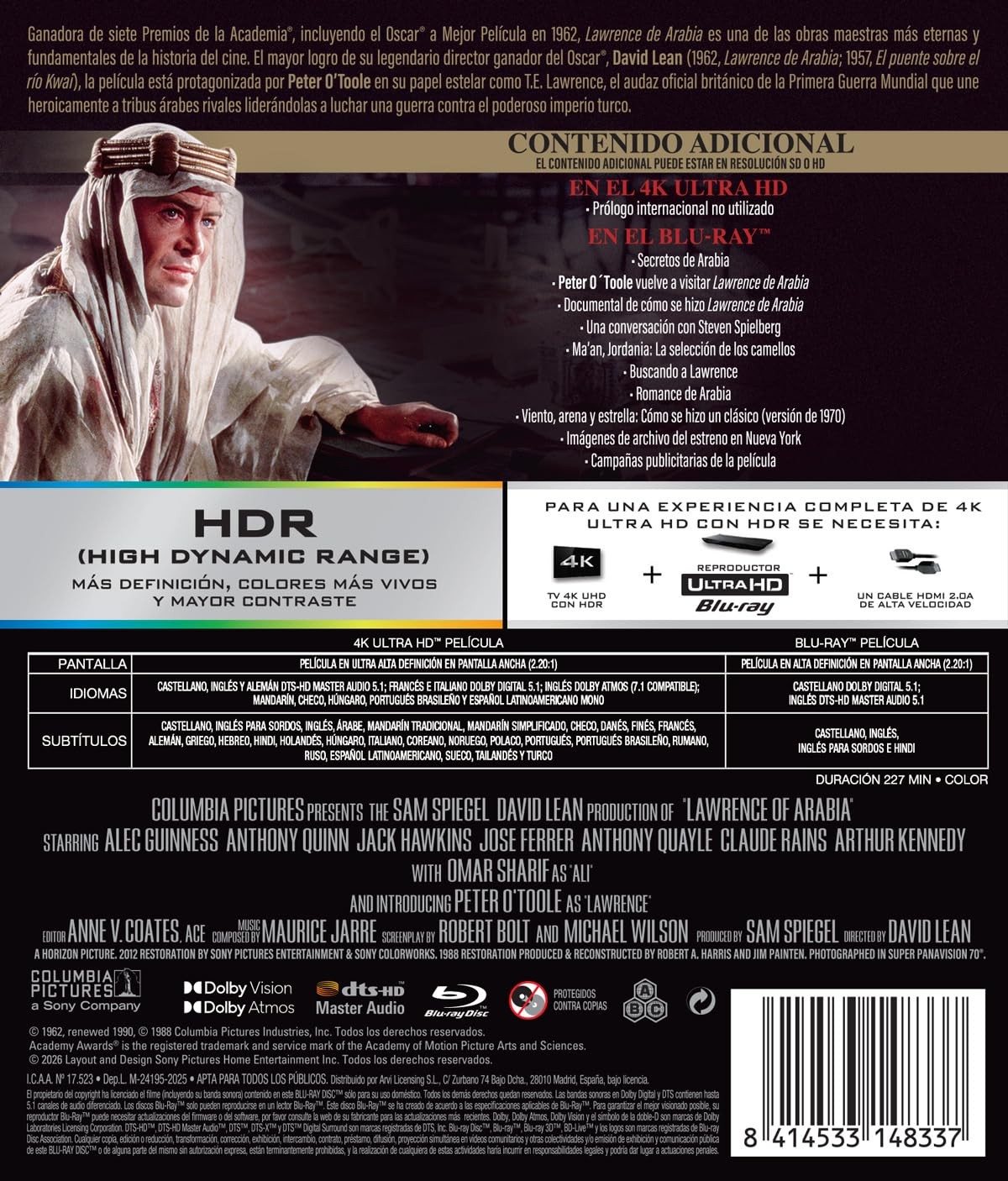 https://back.dvdstorespain.es/es/peliculas/129069-lawrence-de-arabia-4k-uhd-bd-blu-ray-2026--8414533148337.html129069Lawrence de Arabia [4K UHD, Blu-ray] (1962) Lawrence of ArabiaEl Cairo, 1917. Durante la Gran Guerra (1914-1918), T.E. Lawrence (Peter O'Toole), un conflictivo y enigmático oficial británico, es enviado al desierto para participar en una campaña de apoyo a los árabes contra Turquía. Él y su amigo Sherif Alí (Omar Sharif) pondrán en esta misión toda su alma. Los nativos adoran a Lawrence porque ha demostrado sobradamente ser un amante del desierto y del pueblo árabe. En cambio, sus superiores británicos creen que se ha vuelto loco. https://dvdstorespain.es/1124542-home_default/lawrence-de-arabia-4k-uhd-bd-blu-ray-2026-.jpg18.0992instock18.099218.0992002026-02-02T22:31:28+0100/Inicio/Inicio/Películas/Inicio/Nuevos/Inicio/4K-UHD